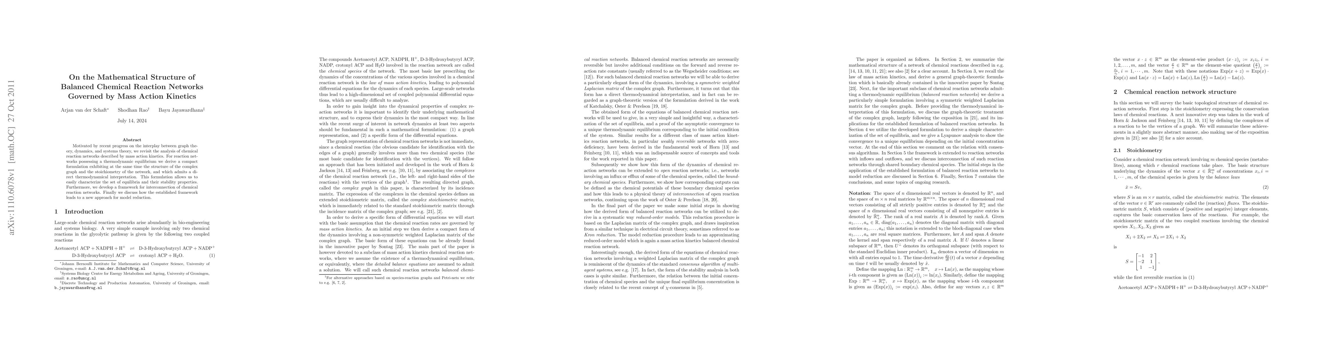 This paper develops a mathematical framework for analyzing chemical reaction networks under mass action kinetics, deriving a compact formulation that integrates graph structure and stoichiometry for equilibrium analysis and stability characterization. It also introduces a method for interconnecting reaction networks and proposes a new model reduction approach.