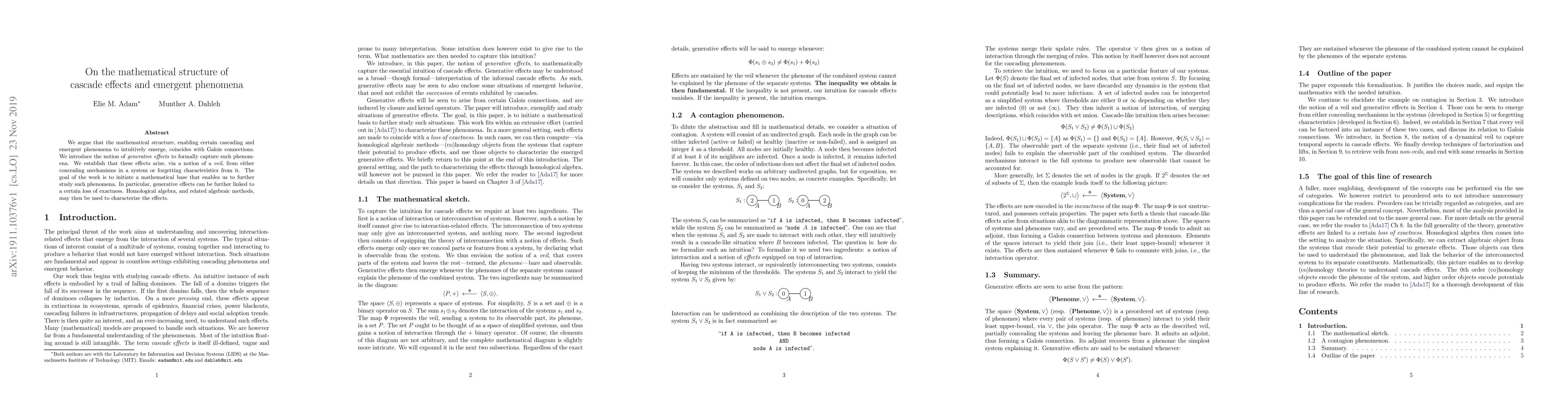 We argue that the mathematical structure, enabling certain cascading and emergent phenomena to intuitively emerge, coincides with Galois connections. We introduce the notion of generative effects to formally capture such phenomena. We establish that these effects arise, via a notion of a veil, from either concealing mechanisms in a system or forgetting characteristics from it. The goal of the work is to initiate a mathematical base that enables us to further study such phenomena. In particular, generative effects can be further linked to a certain loss of exactness. Homological algebra, and related algebraic methods, may then be used to characterize the effects.