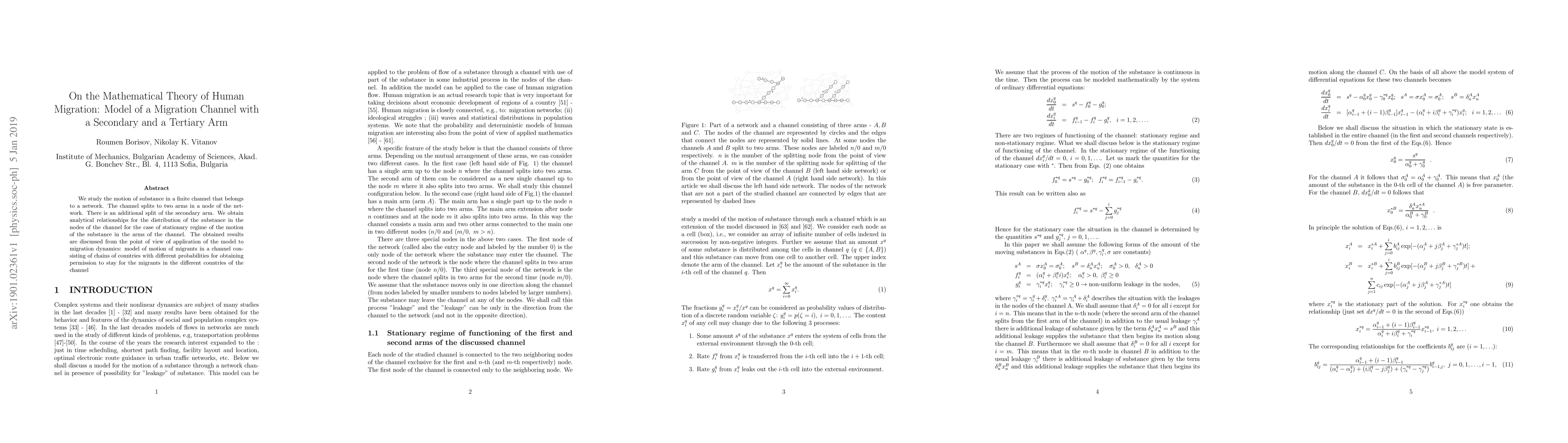 We study the motion of substance in a finite channel that belongs to a network. The channel splits to two arms in a node of the network. There is an additional split of the secondary arm. We obtain analytical relationships for the distribution of the substance in the nodes of the channel for the case of stationary regime of the motion of the substance in the arms of the channel. The obtained results are discussed from the point of view of application of the model to migration dynamics: model of motion of migrants in a channel consisting of chains of countries with different probabilities for obtaining permission to stay for the migrants in the different countries of the channel