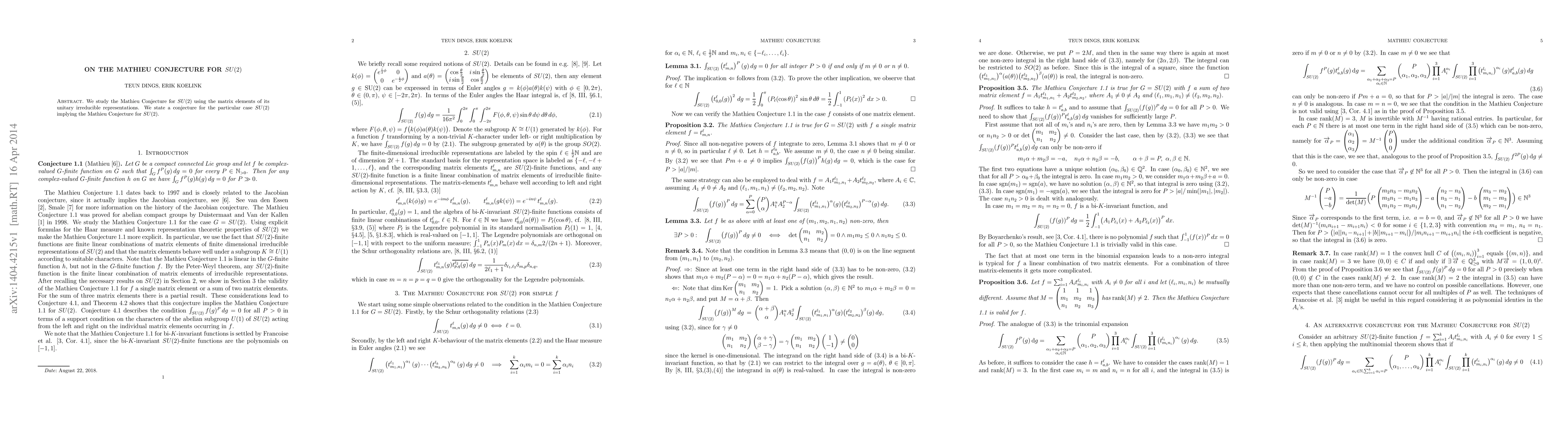 We study the Mathieu Conjecture for $SU(2)$ using the matrix elements of its unitary irreducible representations. We state a conjecture for the particular case $SU(2)$ implying the Mathieu Conjecture for $SU(2)$.