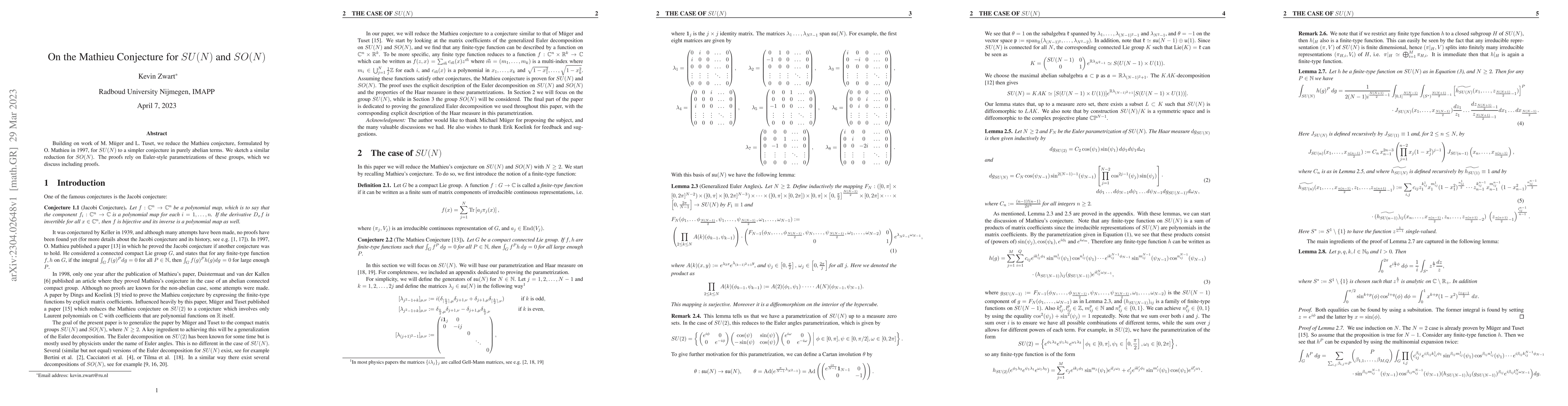 The paper simplifies the Mathieu conjecture for $SU(N)$ to an abelian form and outlines a similar reduction for $SO(N)$, using Euler-style parametrizations and including proofs for both reductions.