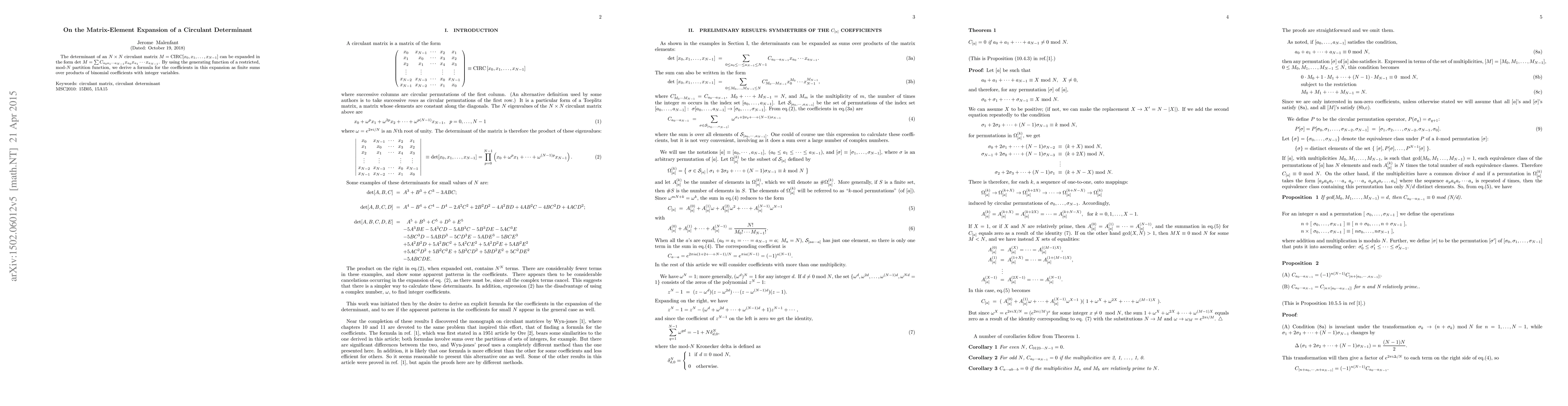 The determinant of an $N \times N$ circulant matrix $M = {\rm CIRC}[x_0, x_1, ..., x_{N-1}$] can be expanded in the form det$ ~M= \sum C_{a_0 a_1 ...a_{N-1}} x_{a_0} x_{a_1}...x_{a_{N-1}}$. By using the generating function of a restricted, mod-$N$ partition function, we derive a formula for the coefficients in this expansion as finite sums over products of binomial coefficients with integer variables.
