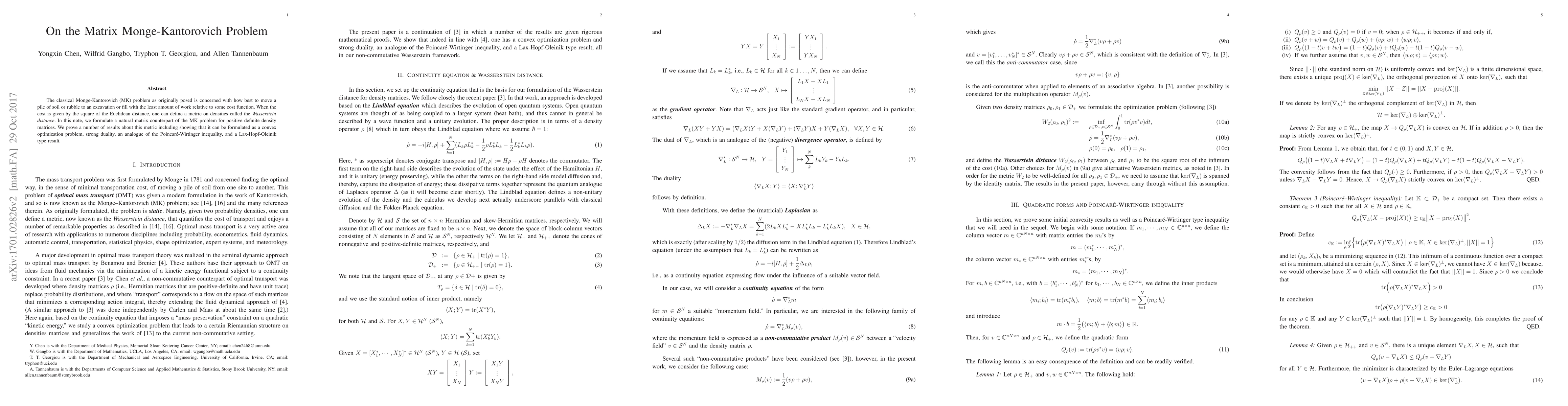 A new approach to optimal mass transport was developed, leveraging convex optimization techniques and quantum mechanical principles.