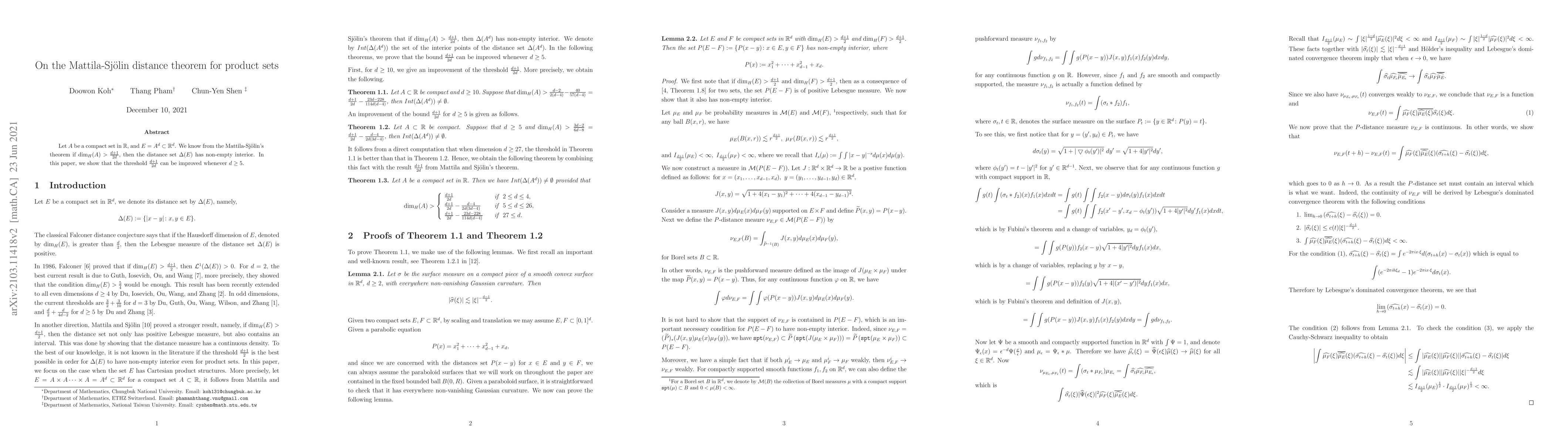 Researchers improved the Mattila-Sj"olin distance theorem's threshold for product sets in d-dimensional space when d is 5 or greater, finding a new boundary for non-empty interior distances.