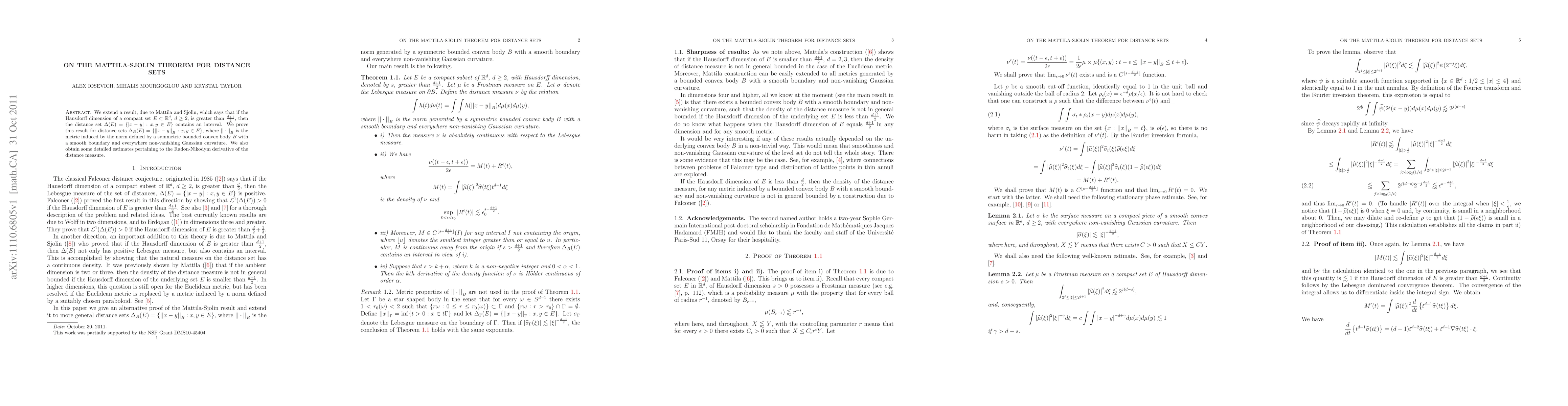 We extend a result, due to Mattila and Sjolin, which says that if the Hausdorff dimension of a compact set $E \subset {\Bbb R}^d$, $d \ge 2$, is greater than $\frac{d+1}{2}$, then the distance set $\Delta(E)=\{|x-y|: x,y \in E \}$ contains an interval. We prove this result for distance sets $\Delta_B(E)=\{{||x-y||}_B: x,y \in E \}$, where ${|| \cdot ||}_B$ is the metric induced by the norm defined by a symmetric bounded convex body $B$ with a smooth boundary and everywhere non-vanishing Gaussian curvature. We also obtain some detailed estimates pertaining to the Radon-Nikodym derivative of the distance measure.