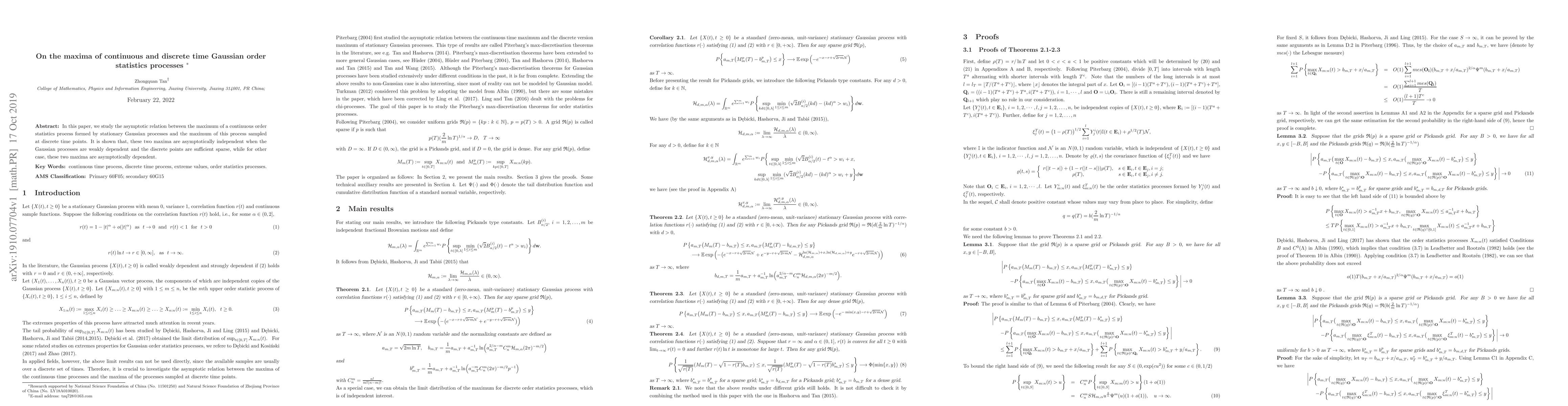 This paper examines the relationship between the maxima of continuous and discrete time Gaussian order statistics processes. It reveals that these maxima are asymptotically independent when Gaussian processes are weakly dependent and discrete points are sufficiently sparse. For other cases, the maxima are asymptotically dependent.