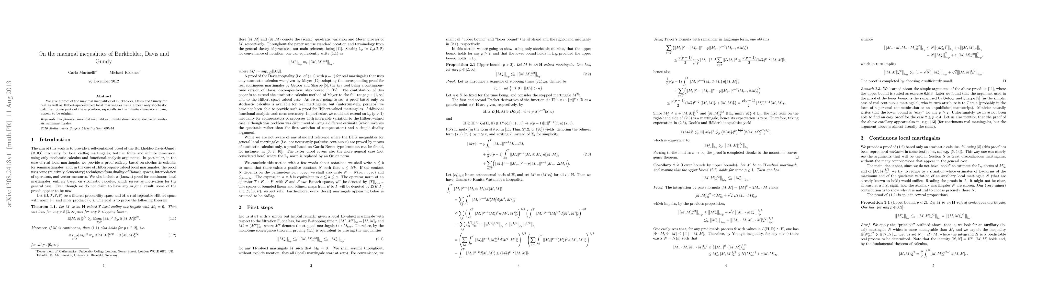 This paper proves the maximal inequalities of Burkholder, Davis, and Gundy for real and Hilbert-space-valued local martingales primarily through stochastic calculus techniques. Some parts of the infinite-dimensional case presented here appear to be original contributions.