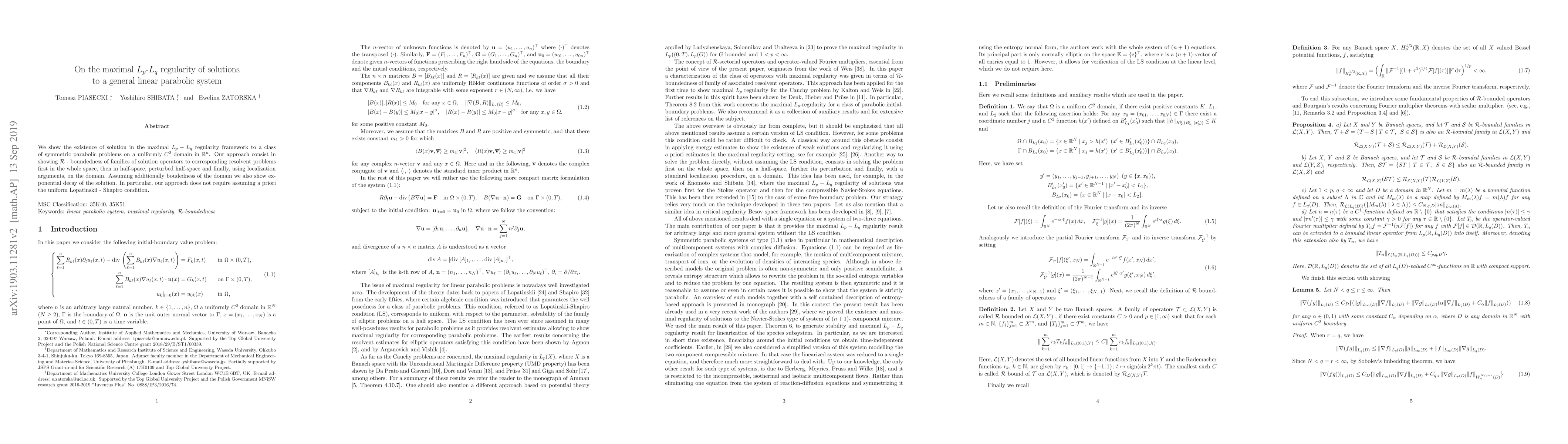 We show the existence of solution in the maximal $L_p-L_q$ regularity framework to a class of symmetric parabolic problems on a uniformly $C^2$ domain in ${\mathcal R}$. Our approach consist in showing ${\mathcal R}$ - boundedness of families of solution operators to corresponding resolvent problems first in the whole space, then in half-space, perturbed half-space and finally, using localization arguments, on the domain. Assuming additionally boudedness of the domain we also show exponential decay of the solution. In particular, our approach does not require assuming a priori the uniform Lopatinskii - Shapiro condition.