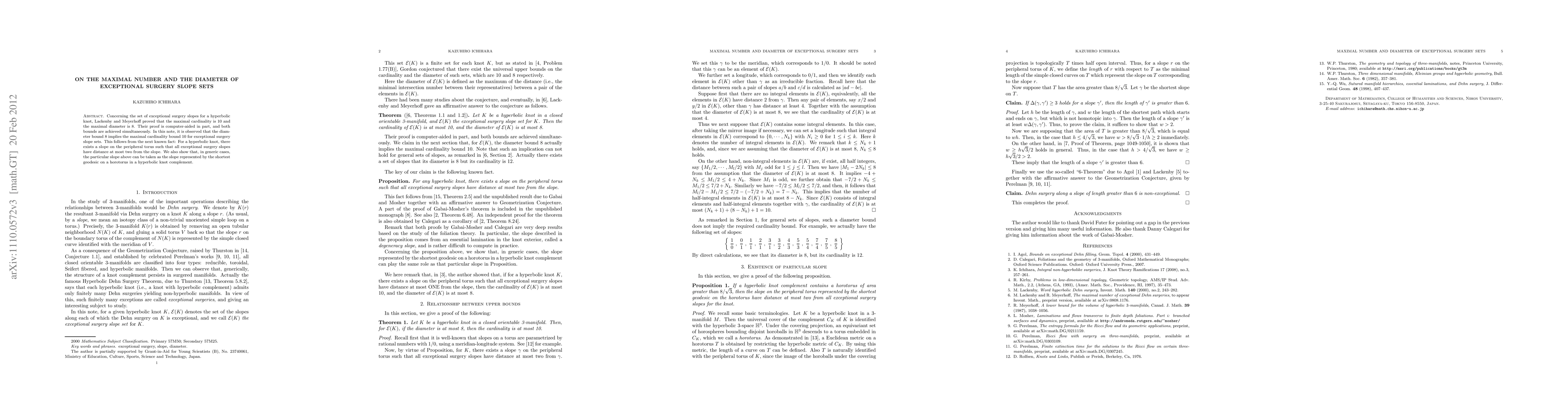 Concerning the set of exceptional surgery slopes for a hyperbolic knot, Lackenby and Meyerhoff proved that the maximal cardinality is 10 and the maximal diameter is 8. Their proof is computer-aided in part, and both bounds are achieved simultaneously. In this note, it is observed that the diameter bound 8 implies the maximal cardinality bound 10 for exceptional surgery slope sets. This follows from the next known fact: For a hyperbolic knot, there exists a slope on the peripheral torus such that all exceptional surgery slopes have distance at most two from the slope. We also show that, in generic cases, that particular slope above can be taken as the slope represented by the shortest geodesic on a horotorus in a hyperbolic knot complement.