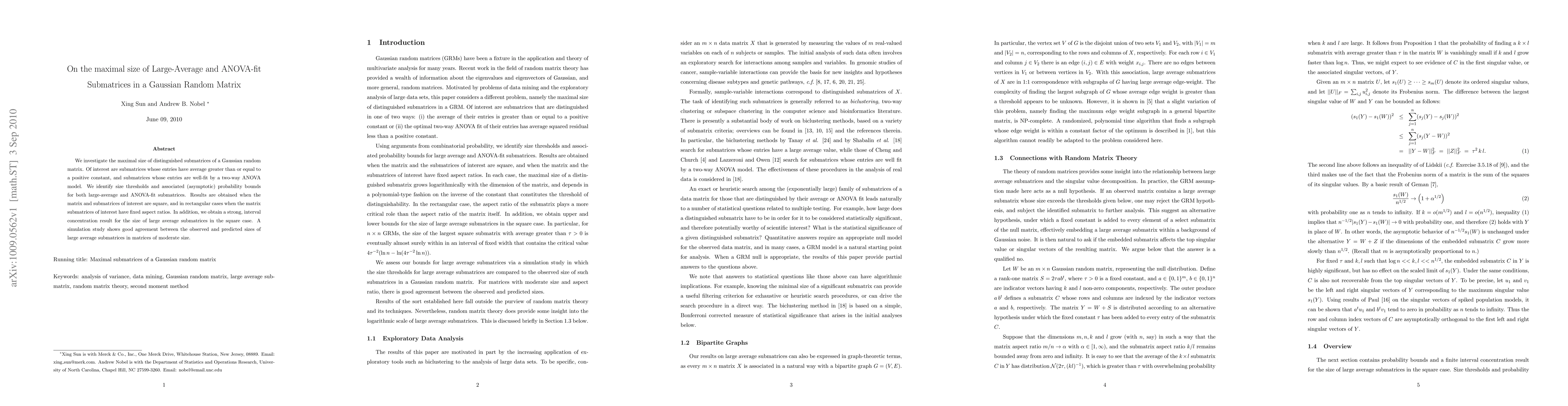 We investigate the maximal size of distinguished submatrices of a Gaussian random matrix. Of interest are submatrices whose entries have average greater than or equal to a positive constant, and submatrices whose entries are well-fit by a two-way ANOVA model. We identify size thresholds and associated (asymptotic) probability bounds for both large-average and ANOVA-fit submatrices. Results are obtained when the matrix and submatrices of interest are square, and in rectangular cases when the matrix submatrices of interest have fixed aspect ratios. In addition, we obtain a strong, interval concentration result for the size of large average submatrices in the square case. A simulation study shows good agreement between the observed and predicted sizes of large average submatrices in matrices of moderate size.