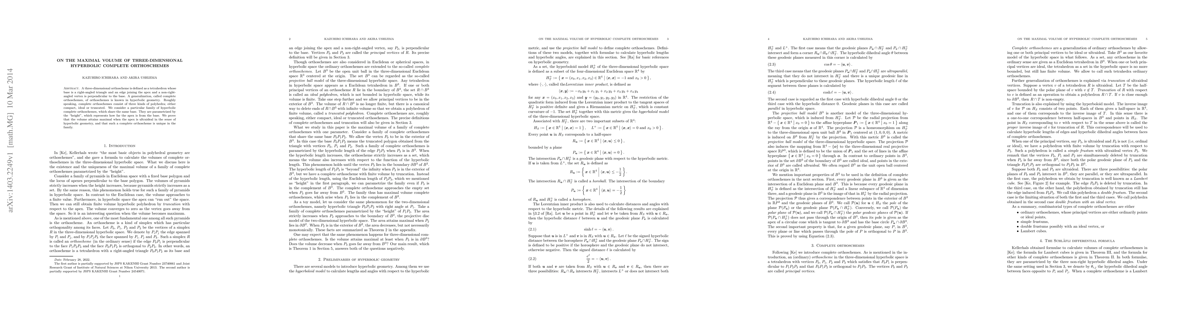 A three-dimensional orthoscheme is defined as a tetrahedron whose base is a right-angled triangle and an edge joining the apex and a non-right-angled vertex is perpendicular to the base. A generalization, called complete orthoschemes, of orthoschemes is known in hyperbolic geometry. Roughly speaking, complete orthoschemes consist of three kinds of polyhedra; either compact, ideal or truncated. We consider a particular family of hyperbolic complete orthoschemes, which share the same base. They are parametrized by the "height", which represents how far the apex is from the base. We prove that the volume attains maximal when the apex is ultraideal in the sense of hyperbolic geometry, and that such a complete orthoscheme is unique in the family.