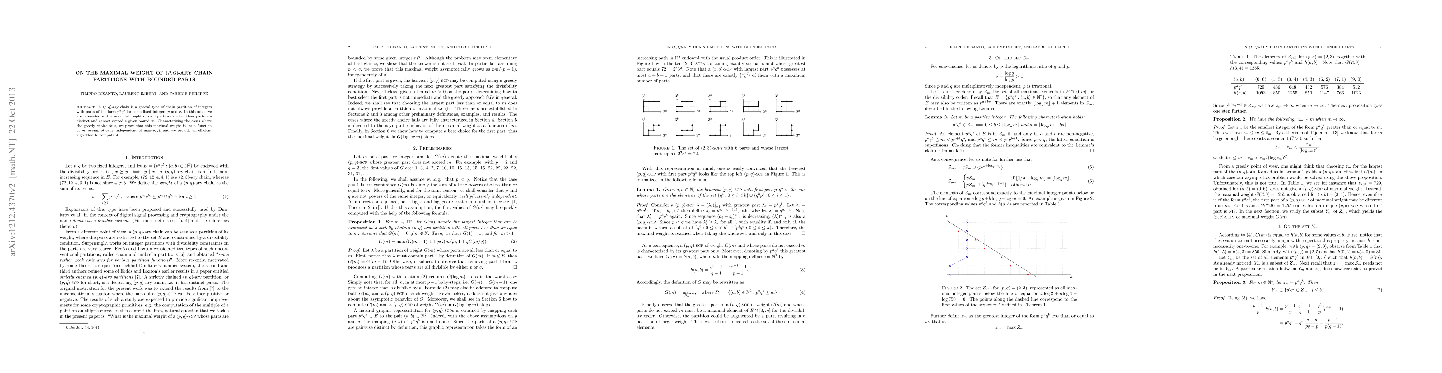 This paper explores the maximal weight of $(p,q)$-ary chain partitions with distinct parts not exceeding a bound $m$, proving that the maximal weight is asymptotically independent of $\max(p,q)$ and presenting an efficient algorithm for its computation. It also characterizes scenarios where the greedy choice method does not apply.