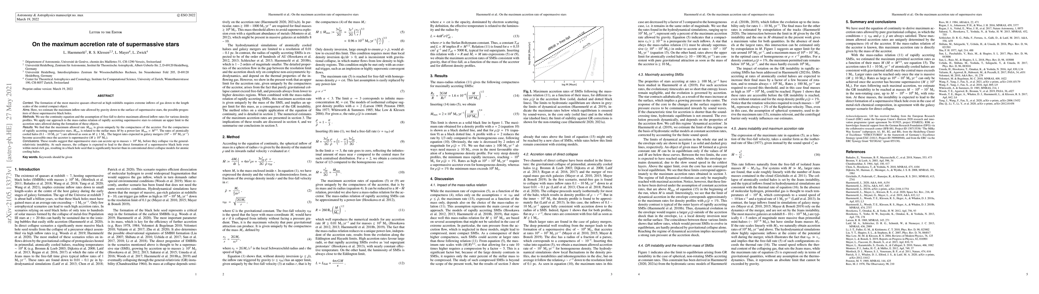 This paper estimates the maximum accretion rate for supermassive stars, finding that the rate is proportional to the stellar mass raised to the power of 3/4. It concludes that these stars can grow to over 10^6 solar masses before collapsing into supermassive black holes, providing a heavier seed compared to conventional models.