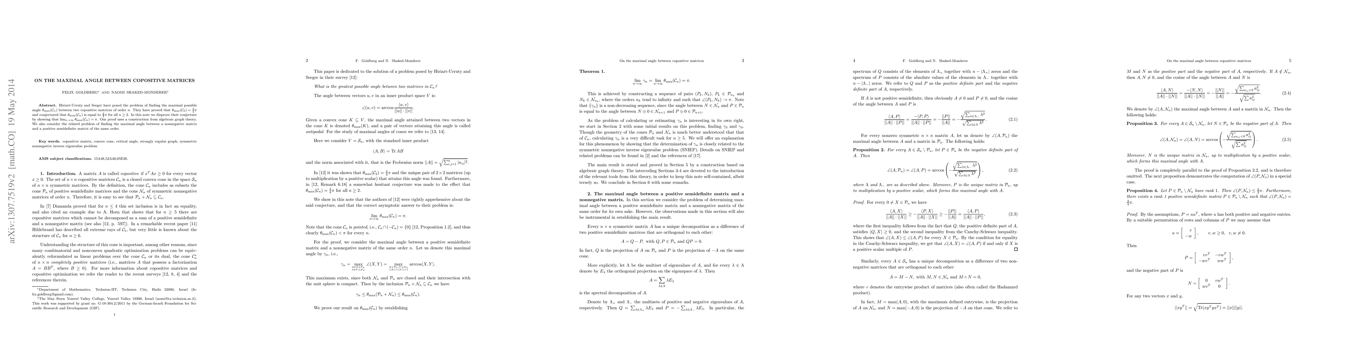 Hiriart-Urruty and Seeger have posed the problem of finding the maximal possible angle $\theta_{\max}(\mathcal{C}_{n})$ between two copositive matrices of order $n$. They have proved that $\theta_{\max}(\mathcal{C}_{2})=\frac{3}{4}\pi$ and conjectured that $\theta_{\max}(\mathcal{C}_{n})$ is equal to $\frac{3}{4}\pi$ for all $n \geq 2$. In this note we disprove their conjecture by showing that $\lim_{n \rightarrow \infty}{\theta_{\max}(\mathcal{C}_{n})}=\pi$. Our proof uses a construction from algebraic graph theory. We also consider the related problem of finding the maximal angle between a nonnegative matrix and a positive semidefinite matrix of the same order.