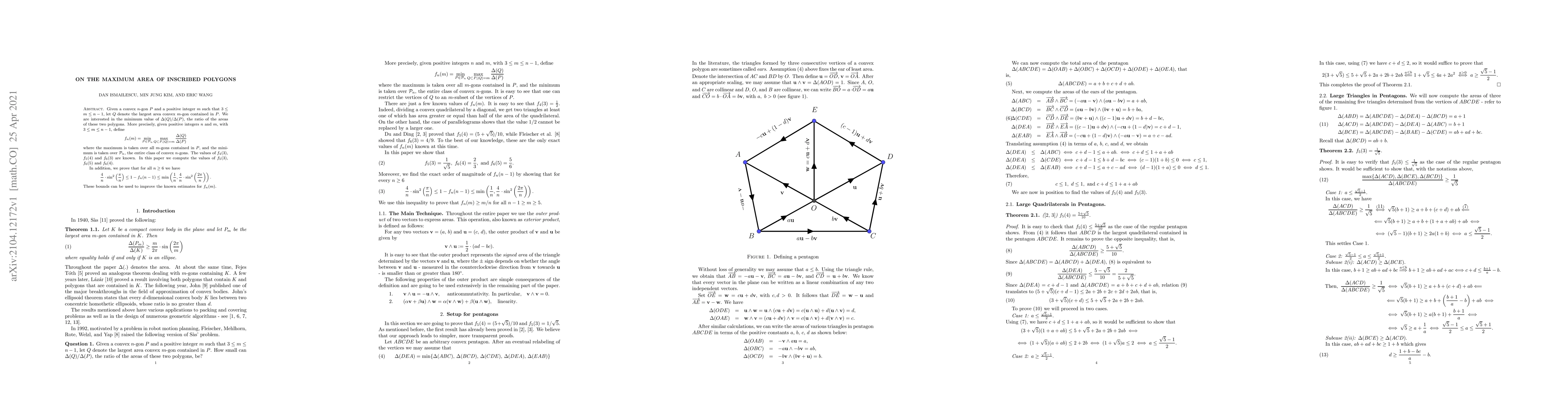 Researchers computed the values of $f_5(3)$, $f_6(5)$ and $f_6(4)$, providing new estimates for the minimum ratio of areas between inscribed polygons, and established bounds to improve these estimates.