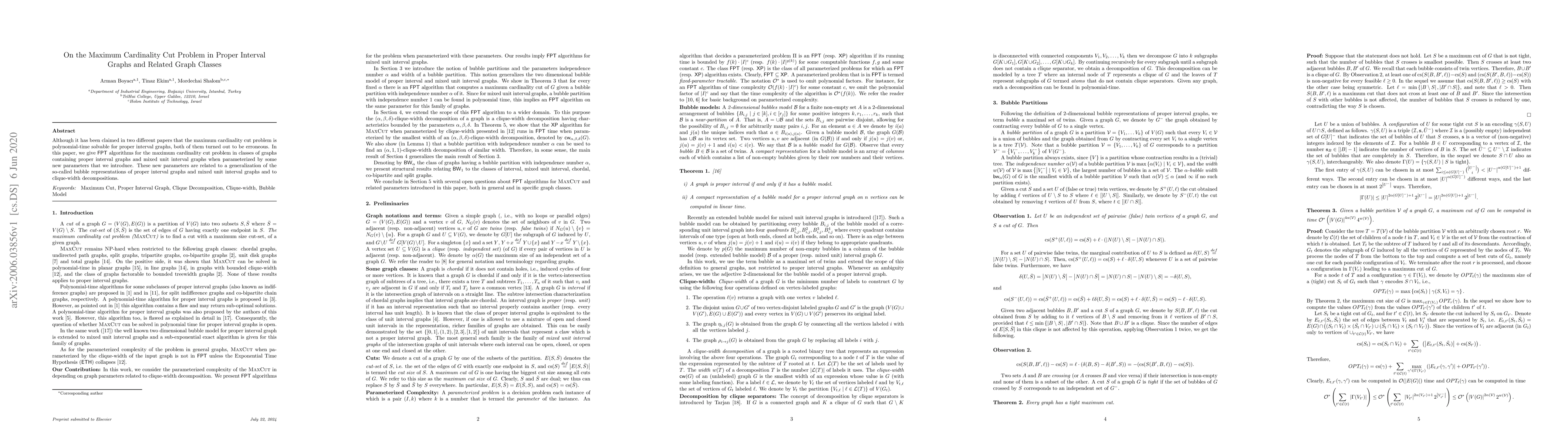 The paper introduces bubble partitions of graphs and new parameters for clique-width decompositions, then analyzes the Maximum Cardinality Cut (MaxCut) problem using Fixed-Parameter Tractability (FPT) algorithms parameterized by these parameters for proper interval graphs and related graph classes.