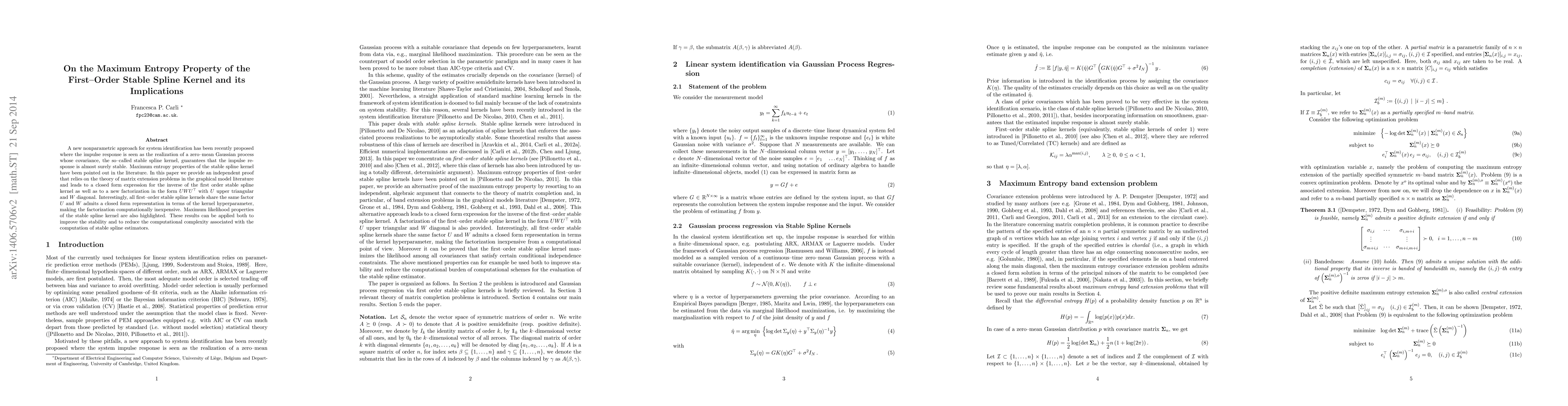 A new nonparametric approach for system identification has been recently proposed where the impulse response is seen as the realization of a zero--mean Gaussian process whose covariance, the so--called stable spline kernel, guarantees that the impulse response is almost surely stable. Maximum entropy properties of the stable spline kernel have been pointed out in the literature. In this paper we provide an independent proof that relies on the theory of matrix extension problems in the graphical model literature and leads to a closed form expression for the inverse of the first order stable spline kernel as well as to a new factorization in the form $UWU^\top$ with $U$ upper triangular and $W$ diagonal. Interestingly, all first--order stable spline kernels share the same factor $U$ and $W$ admits a closed form representation in terms of the kernel hyperparameter, making the factorization computationally inexpensive. Maximum likelihood properties of the stable spline kernel are also highlighted. These results can be applied both to improve the stability and to reduce the computational complexity associated with the computation of stable spline estimators.