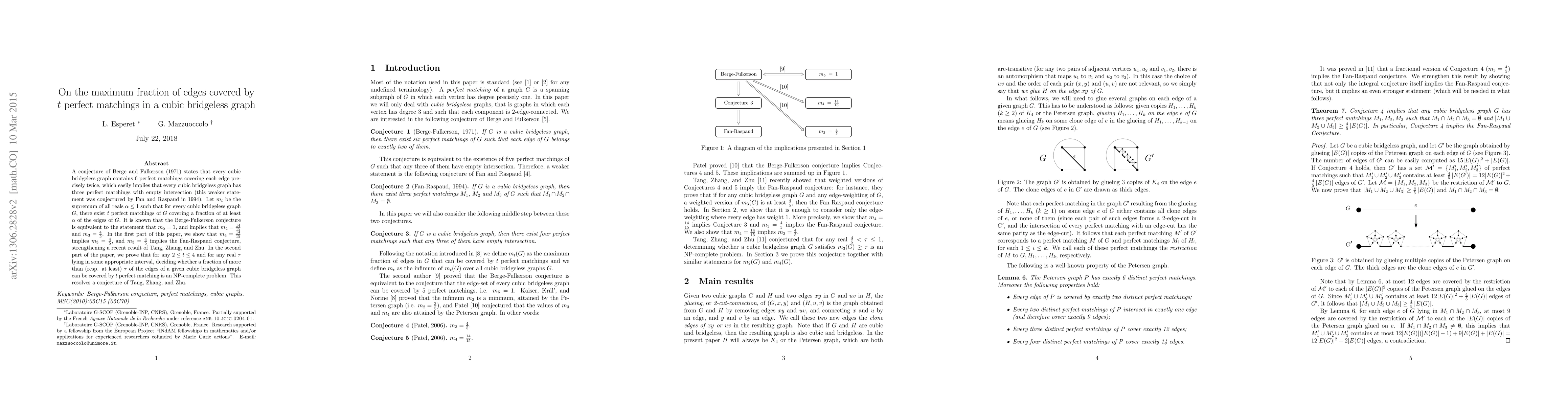 This paper investigates the maximum fraction of edges covered by t perfect matchings in cubic bridgeless graphs. It proves that $m_4 = \frac{14}{15}$ implies $m_3 = \frac{4}{5}$, thereby strengthening the Fan-Raspaud conjecture, and demonstrates that deciding edge coverage by perfect matchings in such graphs is NP-complete.