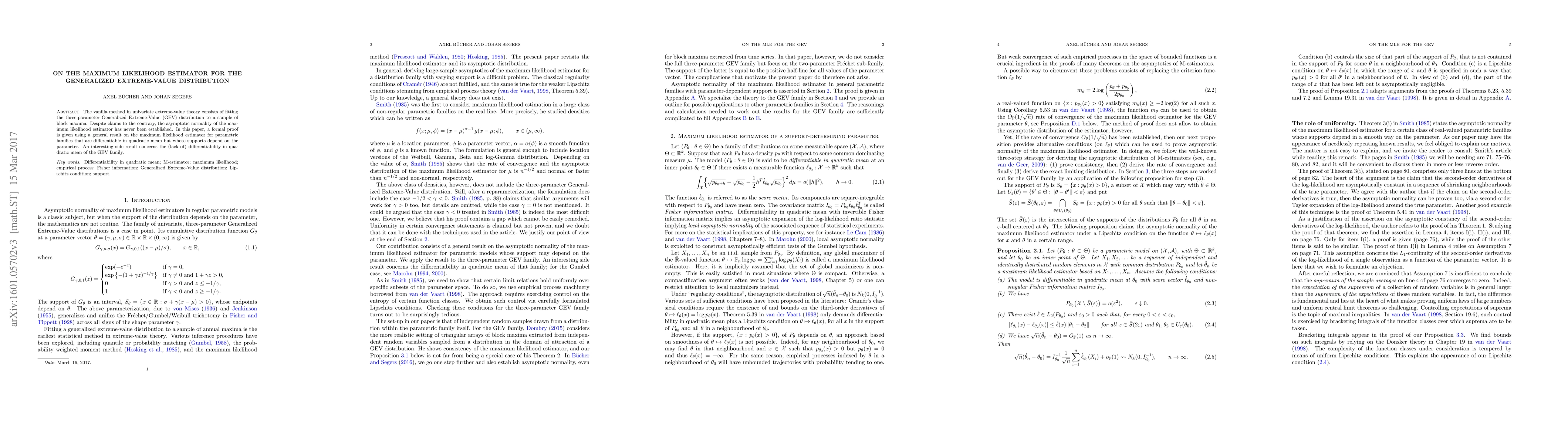 This paper provides a formal proof of the asymptotic normality of the maximum likelihood estimator for the Generalized Extreme-Value distribution, addressing previous claims. It also discusses the differentiability in quadratic mean of the GEV family, revealing an interesting side result.