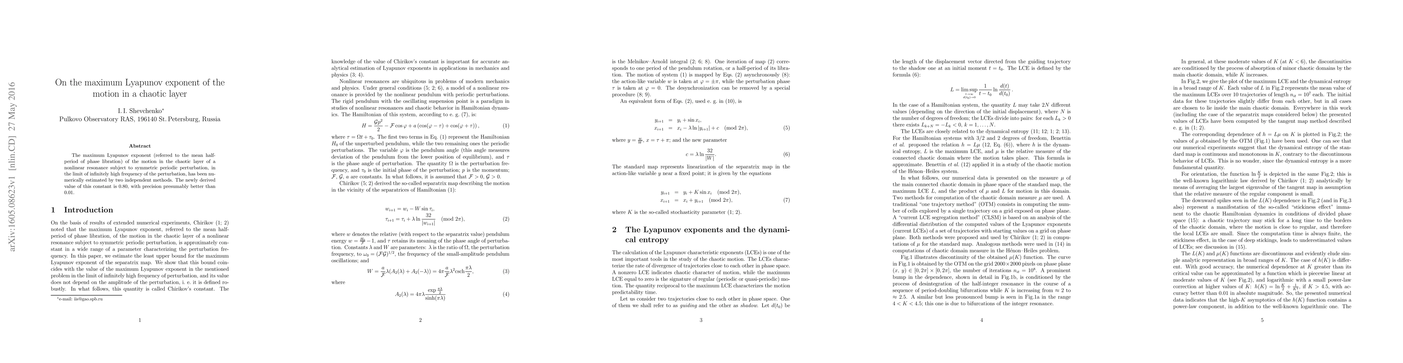 The maximum Lyapunov exponent (referred to the mean half-period of phase libration) of the motion in the chaotic layer of a nonlinear resonance subject to symmetric periodic perturbation, in the limit of infinitely high frequency of the perturbation, has been numerically estimated by two independent methods. The newly derived value of this constant is 0.80, with precision presumably better than 0.01.