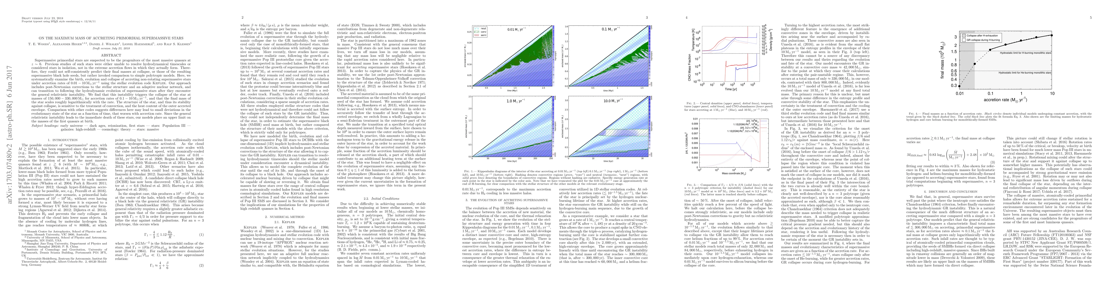 This paper investigates the maximum mass of accreting supermassive primordial stars using the KEPLER code, finding that the general relativistic instability triggers collapse at masses between 150,000-330,000 solar masses for accretion rates of 0.1-10 solar masses per year. The study highlights the importance of convection treatment and accretion rate on the star's stability and final mass.