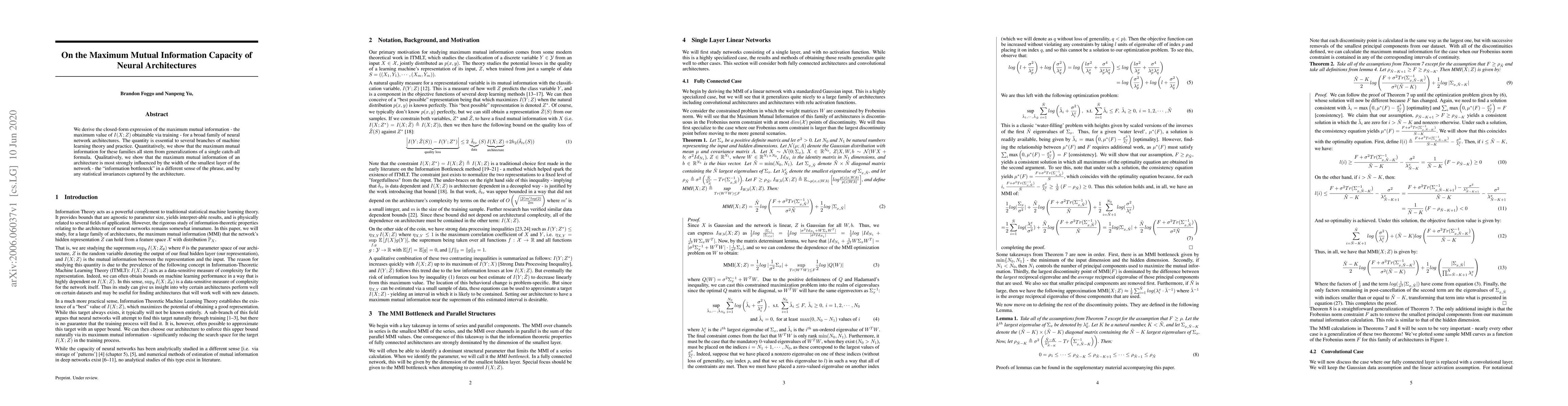 The paper derives closed-form expressions for the maximum mutual information (MMI) for a broad family of neural network architectures, including both fully connected and convolutional layers, by generalizing a single formula.