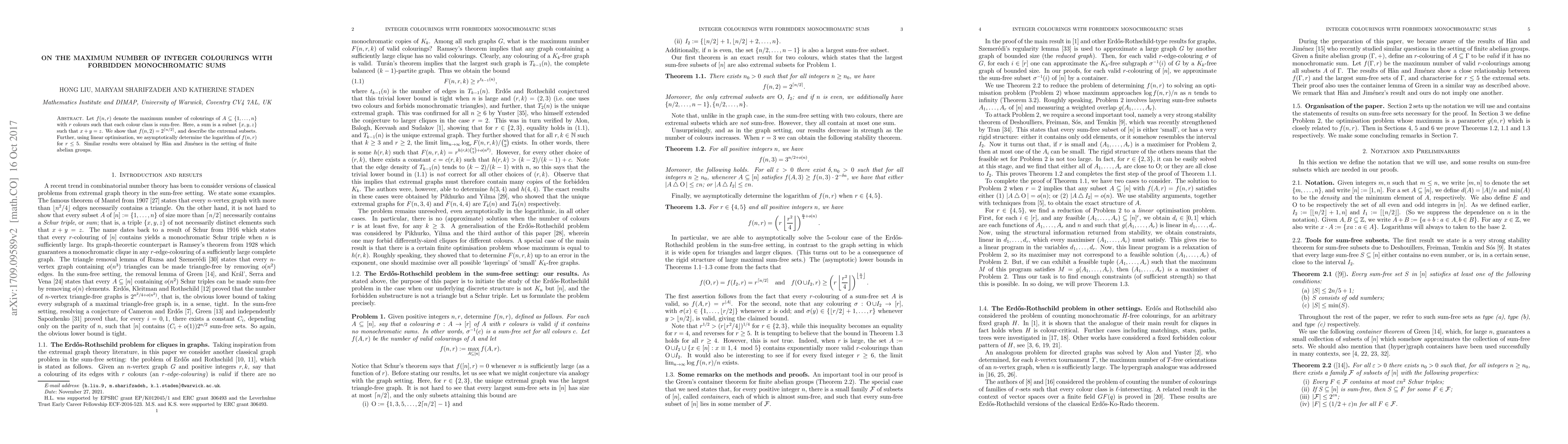 This research paper shows that for coloring integers with 2 colors, the maximum number of sum-free colorings is 2^⌈n/2⌉, and it also determines the logarithm of this value for up to 5 colors using linear optimization.