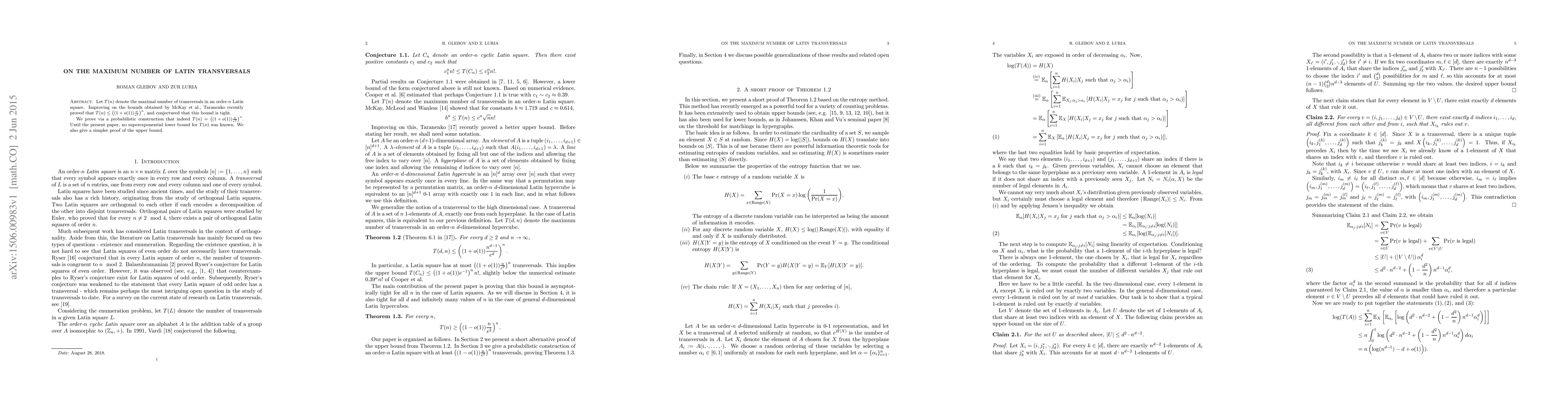 This paper proves that the maximum number of Latin transversals $T(n)$ in an order-$n$ Latin square equals $\left((1+o(1))\frac{n}{e^2}\right)^{n}$, confirming Taranenko's conjecture and providing the first superexponential lower bound for $T(n)$. It also presents a simpler proof for the previously established upper bound.