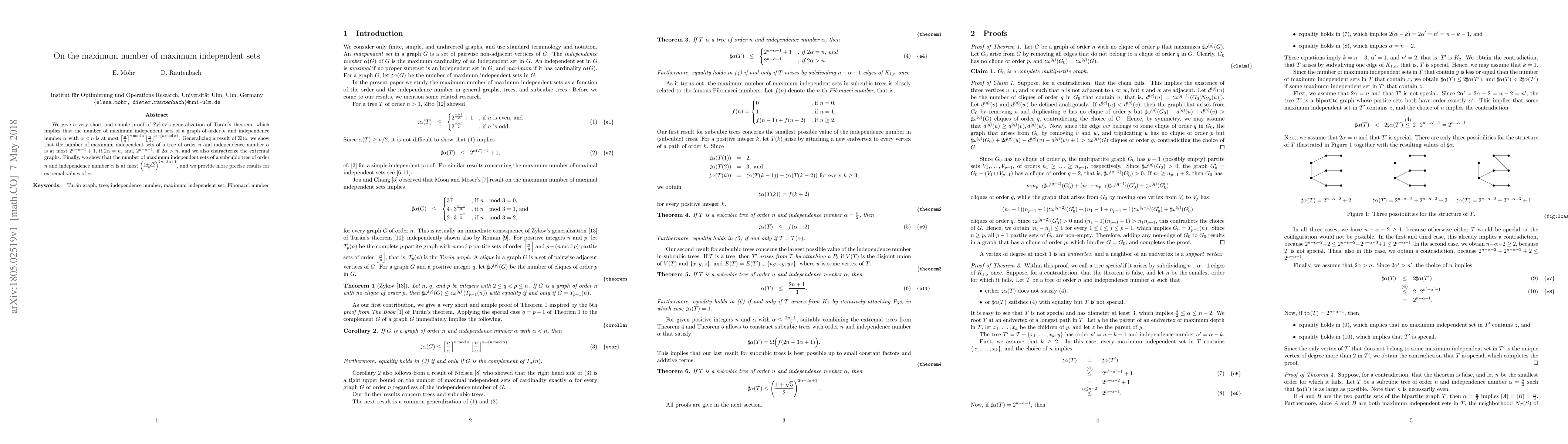 The paper provides a short and simple proof of Zykov's generalization of Turán's theorem, analyzing maximum independent sets in graphs and trees.