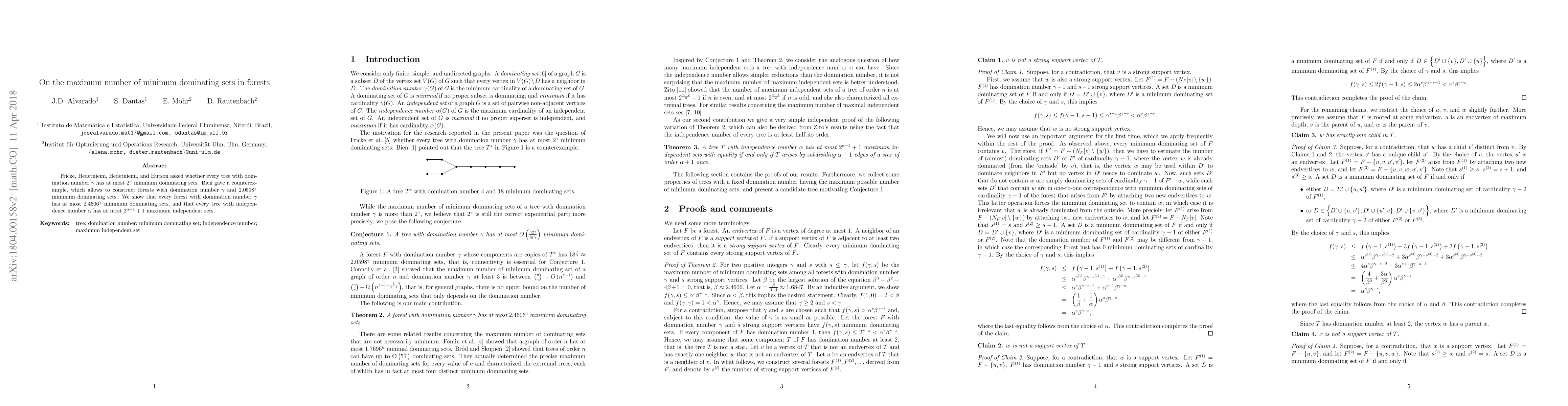 This paper addresses the maximum number of minimum dominating sets in forests, demonstrating that no forest with a domination number $\gamma$ exceeds $2.4606^\gamma$ minimum dominating sets. Additionally, it finds an upper bound for the maximum independent sets in trees with an independence number $\alpha$ as $2^{\alpha-1}+1$.