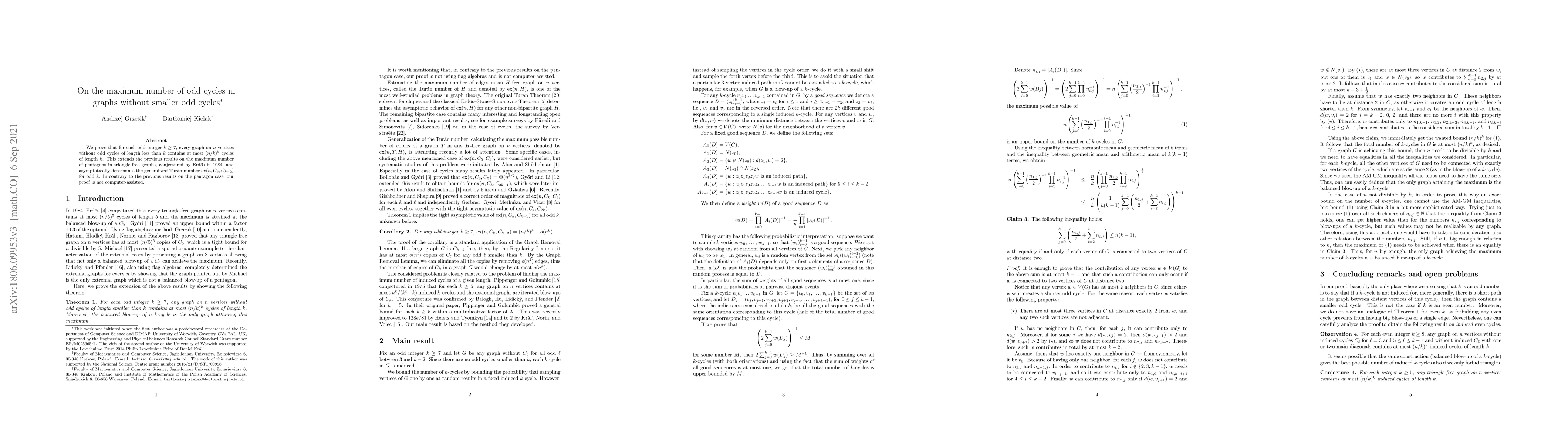 We prove that for each odd integer $k \geq 7$, every graph on $n$ vertices without odd cycles of length less than $k$ contains at most $(n/k)^k$ cycles of length $k$. This generalizes the previous results on the maximum number of pentagons in triangle-free graphs, conjectured by Erd\H{o}s in 1984, and asymptotically determines the generalized Tur\'an number $\mathrm{ex}(n,C_k,C_{k-2})$ for odd $k$. In contrary to the previous results on the pentagon case, our proof is not computer-assisted.