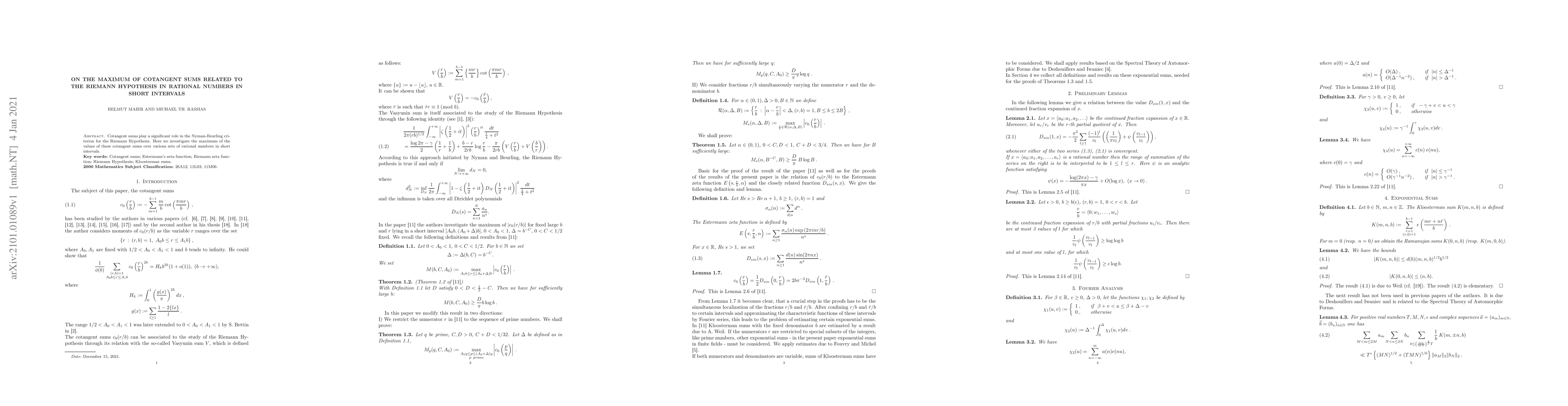 Summary: This paper explores the maximum values of cotangent sums, crucial for the Nyman-Beurling criterion of the Riemann Hypothesis, across rational numbers within short intervals. The findings contribute to understanding the distribution of these sums in relation to the Riemann Hypothesis.
