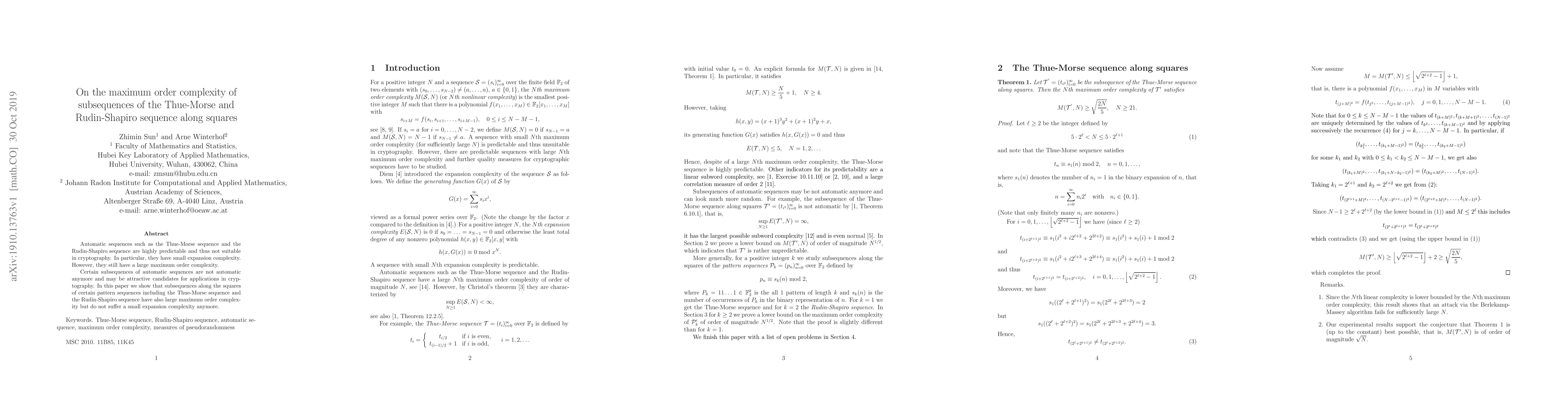 This paper investigates the maximum order complexity of subsequences derived from the Thue-Morse and Rudin-Shapiro sequences along squares. It finds that while these subsequences maintain high complexity, they no longer exhibit the small expansion complexity typical of their original sequences.