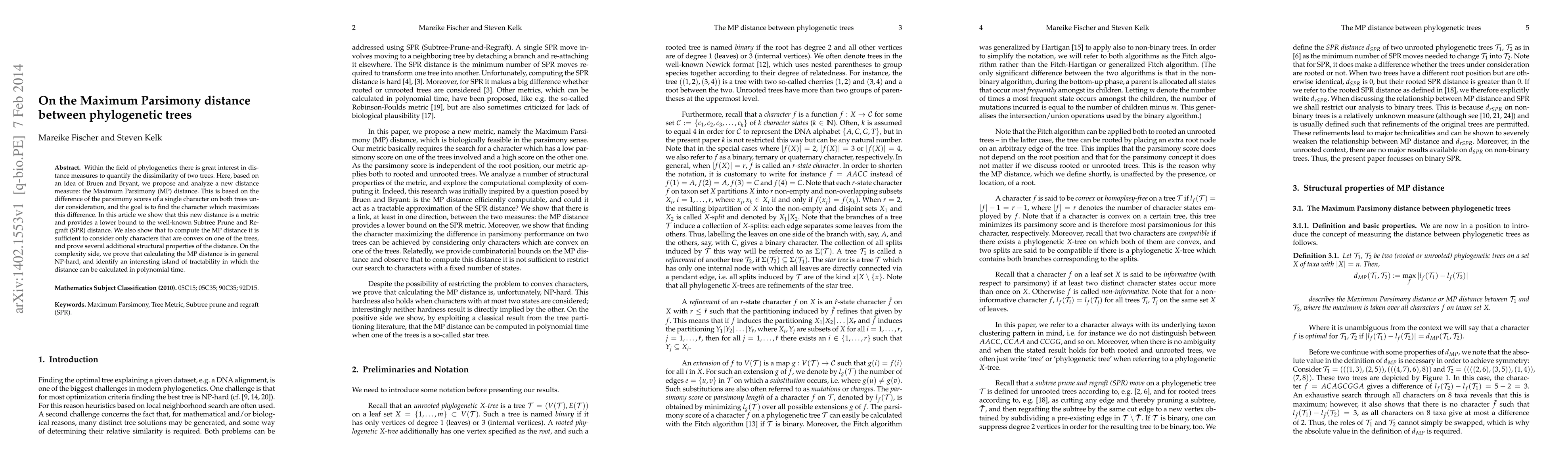 This paper proposes a new Maximum Parsimony (MP) distance to measure the dissimilarity between phylogenetic trees, showing it is a metric and provides a lower bound to the SPR distance. It demonstrates computational complexity, proving NP-hardness in general but finding a tractable subset.