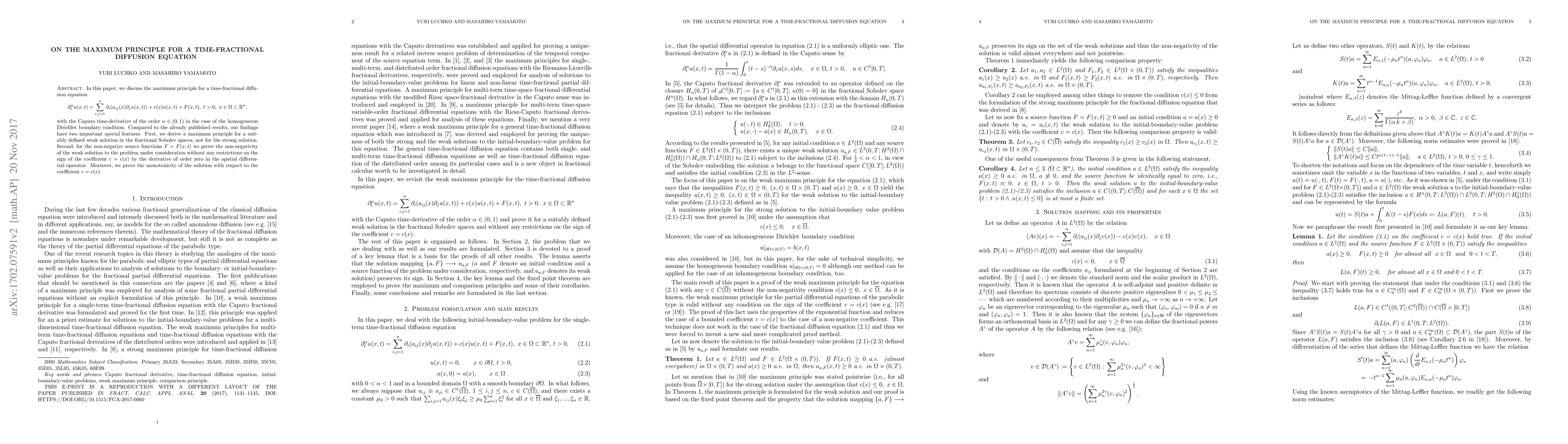 This paper establishes a maximum principle for a time-fractional diffusion equation with a Caputo derivative, focusing on weak solutions in fractional Sobolev spaces. It proves the non-negativity of the weak solution for non-negative source functions without restrictions on the sign of the coefficient, and demonstrates the solution's monotonicity concerning the coefficient.
