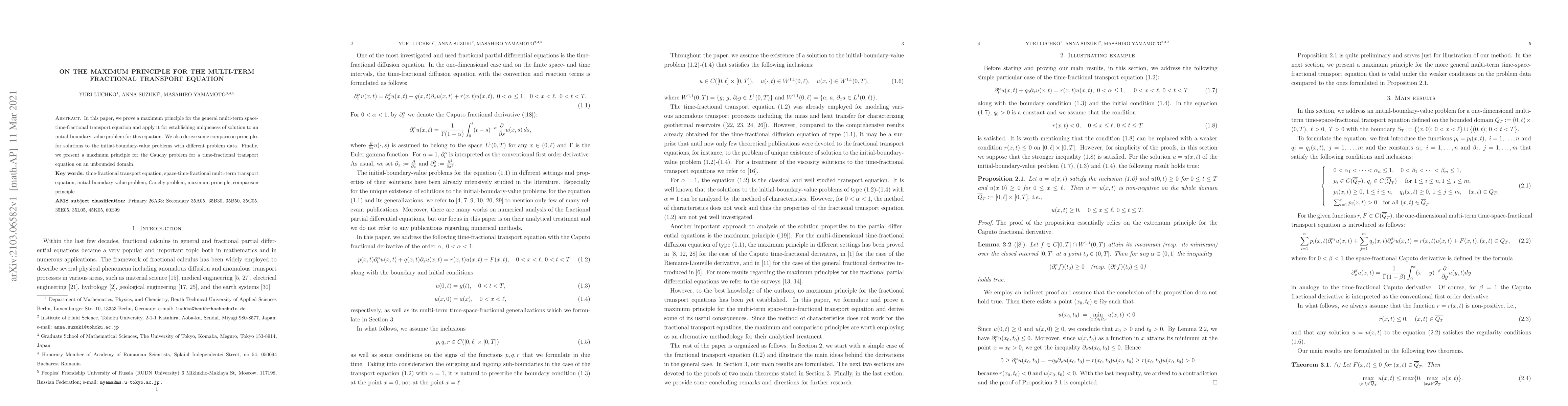 In this paper, we prove a maximum principle for the general multi-term space-time-fractional transport equation and apply it for establishing uniqueness of solution to an initial-boundary-value problem for this equation. We also derive some comparison principles for solutions to the initial-boundary-value problems with different problem data. Finally, we present a maximum principle for the Cauchy problem for a time-fractional transport equation on an unbounded domain.