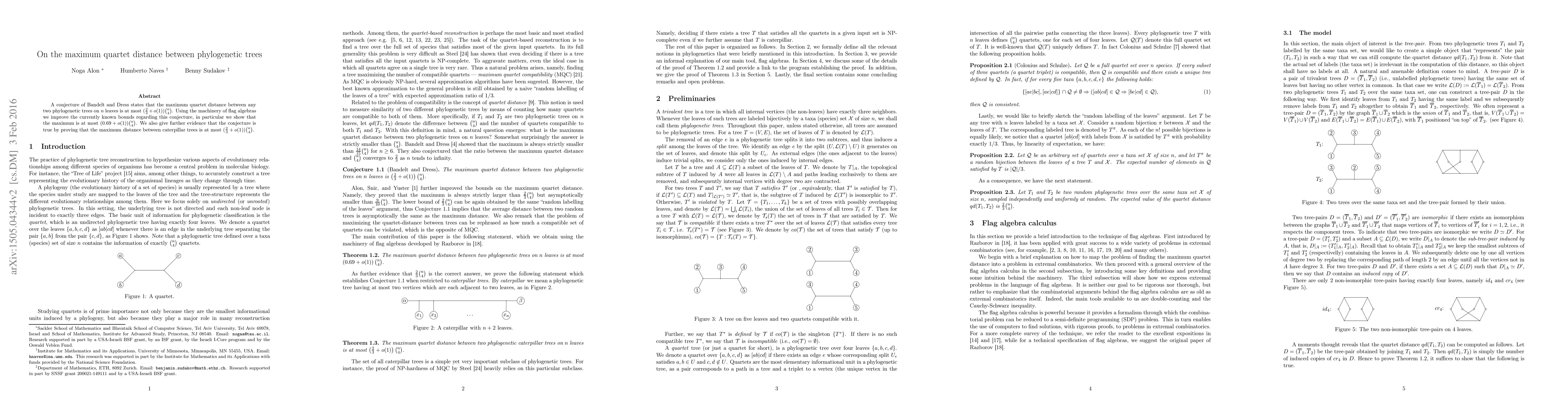 Summary: The paper improves bounds on the maximum quartet distance between phylogenetic trees, showing it is at most $(0.69 +o(1))\binom{n}{4}$, and provides evidence supporting the Bandelt-Dress conjecture by proving the distance between caterpillar trees is at most $(\frac 23 +o(1))\binom{n}{4}$.
