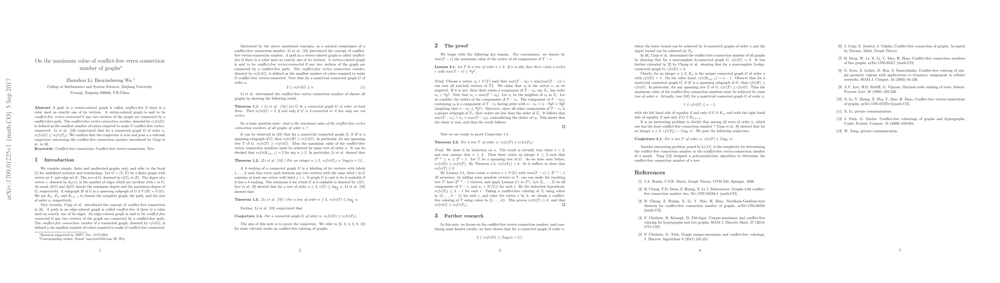 Researchers confirm a conjecture that the conflict-free vertex-connection number of a graph is less than or equal to the conflict-free vertex-connection number of its path with n vertices, and pose a relevant conjecture about the conflict-free connection number.