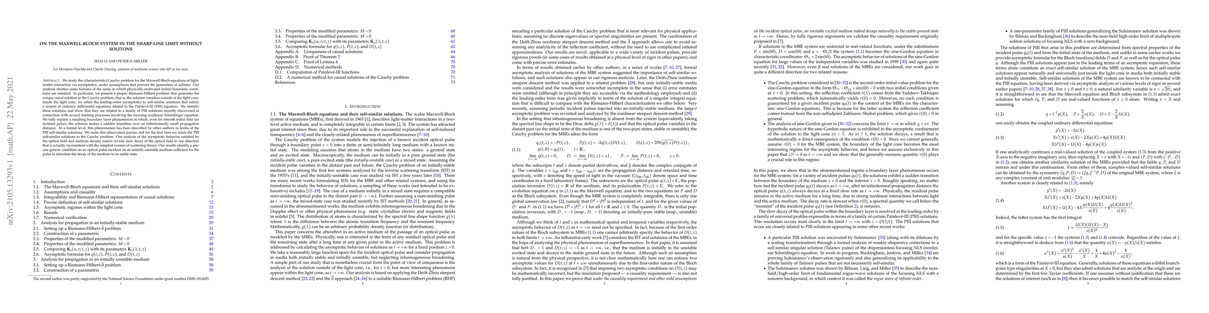 We study the (characteristic) Cauchy problem for the Maxwell-Bloch equations of light-matter interaction via asymptotics, under assumptions that prevent the generation of solitons. Our analysis clarifies some features of the sense in which physically-motivated initial/boundary conditions are satisfied. In particular, we present a proper Riemann-Hilbert problem that generates the unique causal solution to the Cauchy problem, that is, the solution vanishes outside of the light cone. Inside the light cone, we relate the leading-order asymptotics to self-similar solutions that satisfy a system of ordinary differential equations related to the Painlev\'e-III (PIII) equation. We identify these solutions and show that they are related to a family of PIII solutions recently discovered in connection with several limiting processes involving the focusing nonlinear Schr\"odinger equation. We fully explain a resulting boundary layer phenomenon in which, even for smooth initial data (an incident pulse), the solution makes a sudden transition over an infinitesimally small propagation distance. At a formal level, this phenomenon has been described by other authors in terms of the PIII self-similar solutions. We make this observation precise and for the first time we relate the PIII self-similar solutions to the Cauchy problem. Our analysis of the asymptotic behavior satisfied by the optical field and medium density matrix reveals slow decay of the optical field in one direction that is actually inconsistent with the simplest version of scattering theory. Our results identify a precise generic condition on an optical pulse incident on an initially-unstable medium sufficient for the pulse to stimulate the decay of the medium to its stable state.
