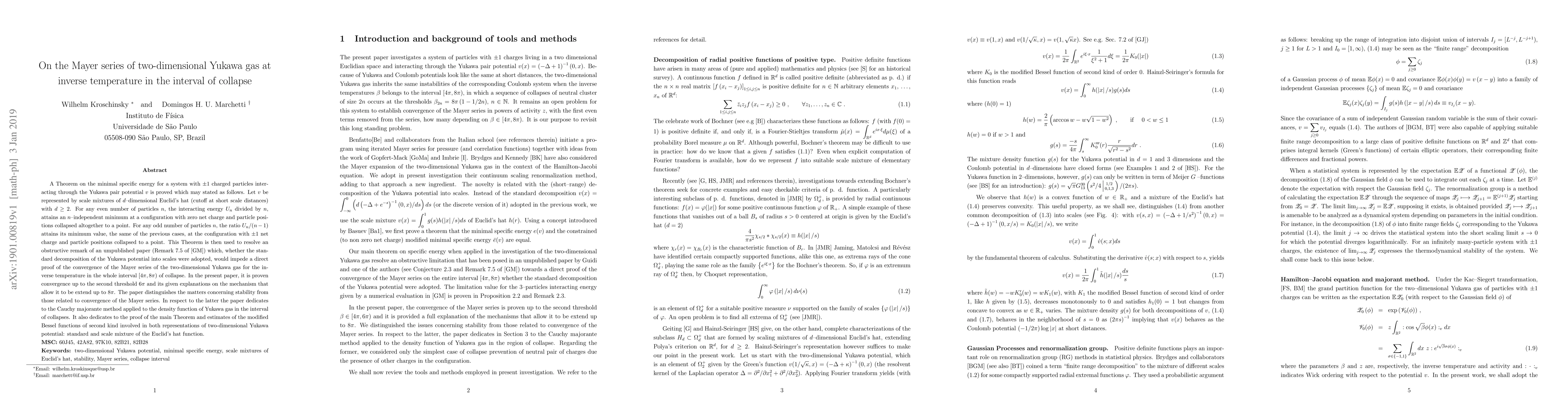 A Theorem on the minimal specific energy for a system with \pm 1 charged particles interacting through the Yukawa pair potential v is proved which may stated as follows. Let v be represented by scale mixtures of d-dimensional Euclid's hat (cutoff at short scale distances) with d\geq 2. For any even number of particles n, the interacting energy U_{n} divided by n, attains an n-independent minimum at a configuration with zero net charge and particle positions collapsed altogether to a point. For any odd number of particles n, the ratio U_{n}/(n-1) attains its minimum value, the same of the previous cases, at the configuration with \pm 1 net charge and particle positions collapsed to a point. This Theorem is then used to resolve an obstructive remark of an unpublished paper (Remark 7.5 of \cite{Guidi-Marchetti}) which, whether the standard decomposition of the Yukawa potential into scales were adopted, would impede a direct proof of the convergence of the Mayer series of the two-dimensional Yukawa gas for the inverse temperature in the whole interval [4\pi ,8\pi ) of collapse. In the present paper, it is proven convergence up to the second threshold 6\pi and its given explanations on the mechanism that allow it to be extend up to 8\pi . The paper distinguishes the matters concerning stability from those related to convergence of the Mayer series. In respect to the latter the paper dedicates to the Cauchy majorante method applied to the density function of Yukawa gas in the interval of collapses. It also dedicates to the proof of the main Theorem and estimates of the modified Bessel functions of second kind involved in both representations of two-dimensional Yukawa potential: standard and scale mixture of the Euclid's hat function.