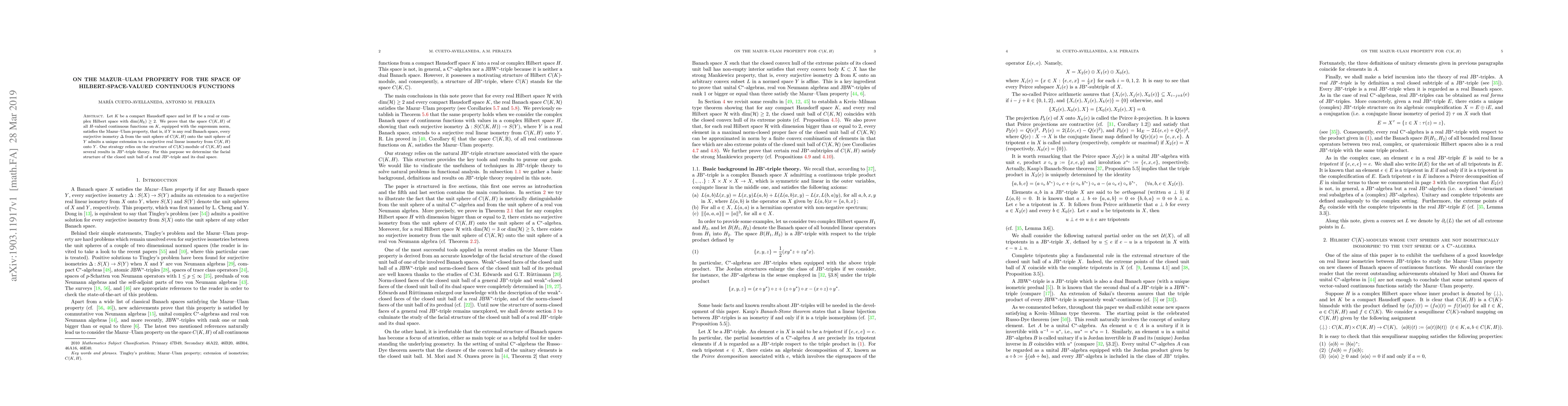Let $K$ be a compact Hausdorff space and let $H$ be a real or complex Hilbert space with dim$(H_\mathbb{R})\geq 2$. We prove that the space $C(K,H)$ of all $H$-valued continuous functions on $K$, equipped with the supremum norm, satisfies the Mazur--Ulam property, that is, if $Y$ is any real Banach space, every surjective isometry $\Delta$ from the unit sphere of $C(K,H)$ onto the unit sphere of $Y$ admits a unique extension to a surjective real linear isometry from $C(K,H)$ onto $Y$. Our strategy relies on the structure of $C(K)$-module of $C(K,H)$ and several results in JB$^*$-triple theory. For this purpose we determine the facial structure of the closed unit ball of a real JB$^*$-triple and its dual space.