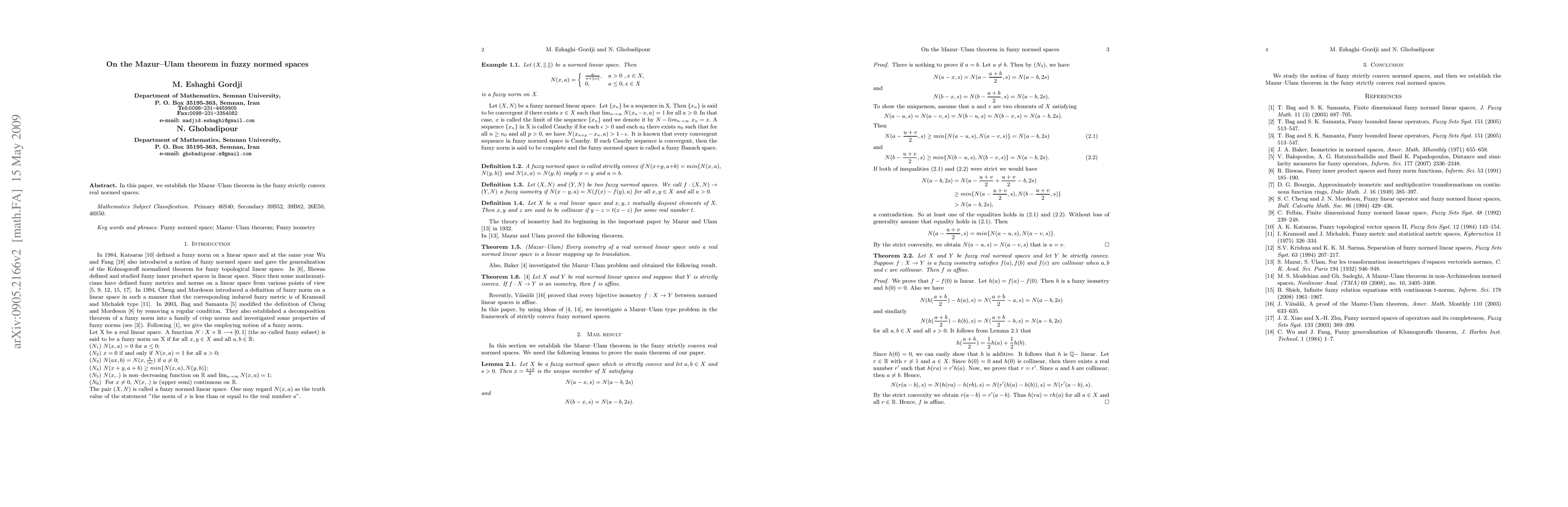 Summary: This paper proves the Mazur-Ulam theorem within the context of fuzzy strictly convex real normed spaces, extending the classical result to a more generalized setting. The result assures the uniqueness of the norm preserving map in this fuzzy normed space framework.
