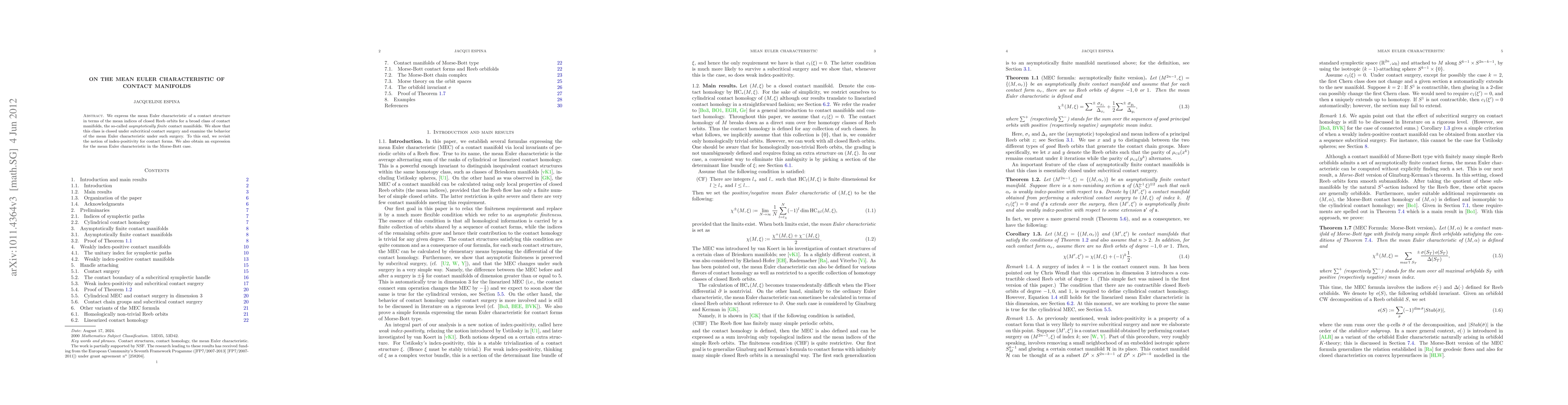 This paper investigates the mean Euler characteristic of asymptotically finite contact manifolds, linking it to the mean indices of closed Reeb orbits. It demonstrates the closure of this class under subcritical surgery and explores the behavior of the mean Euler characteristic during such operations, while also addressing the Morse-Bott case.