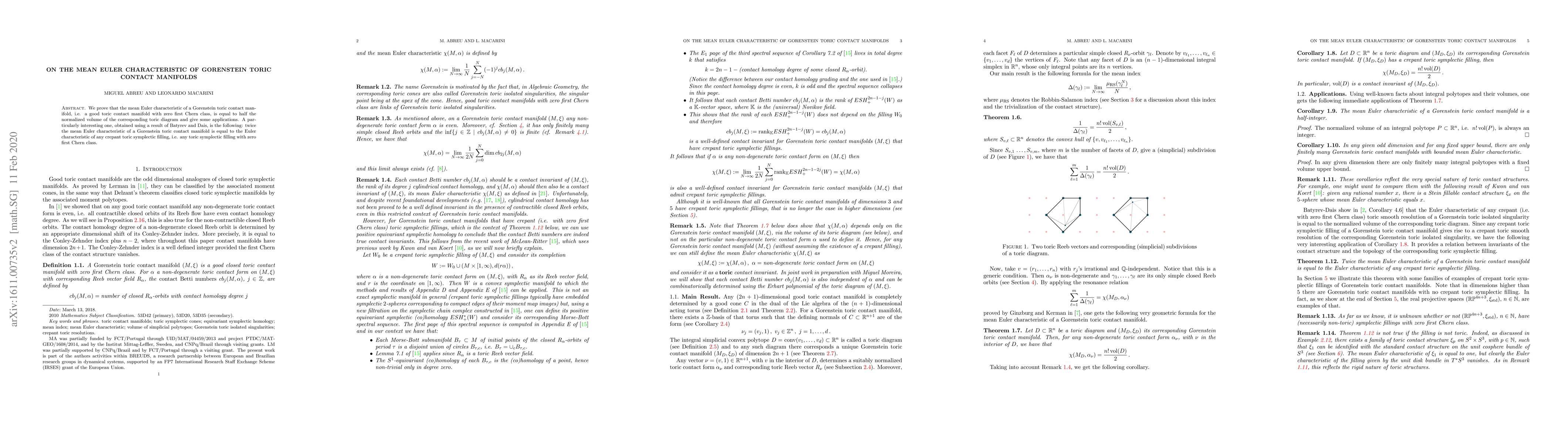 We prove that the mean Euler characteristic of a Gorenstein toric contact manifold, i.e. a good toric contact manifold with zero first Chern class, is equal to half the normalized volume of the corresponding toric diagram and give some applications. A particularly interesting one, obtained using a result of Batyrev and Dais, is the following: twice the mean Euler characteristic of a Gorenstein toric contact manifold is equal to the Euler characteristic of any crepant toric symplectic filling, i.e. any toric symplectic filling with zero first Chern class.