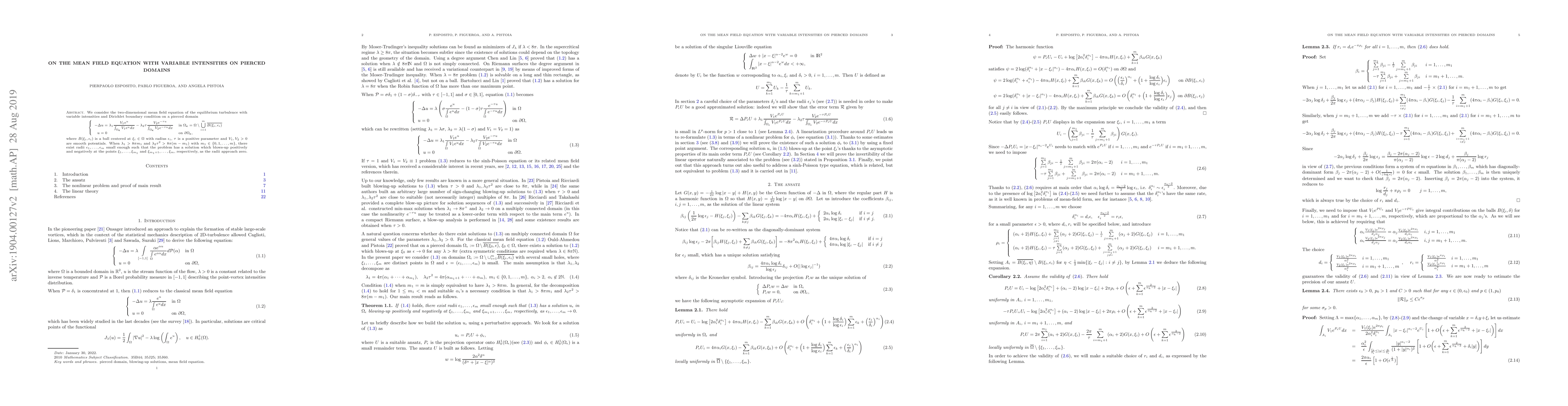 Researchers studied a two-dimensional mean field equation that simulates turbulence with variable intensities on pierced domains. They found conditions under which the problem has solutions that blow up positively and negatively at specific points as the domain's size approaches zero.