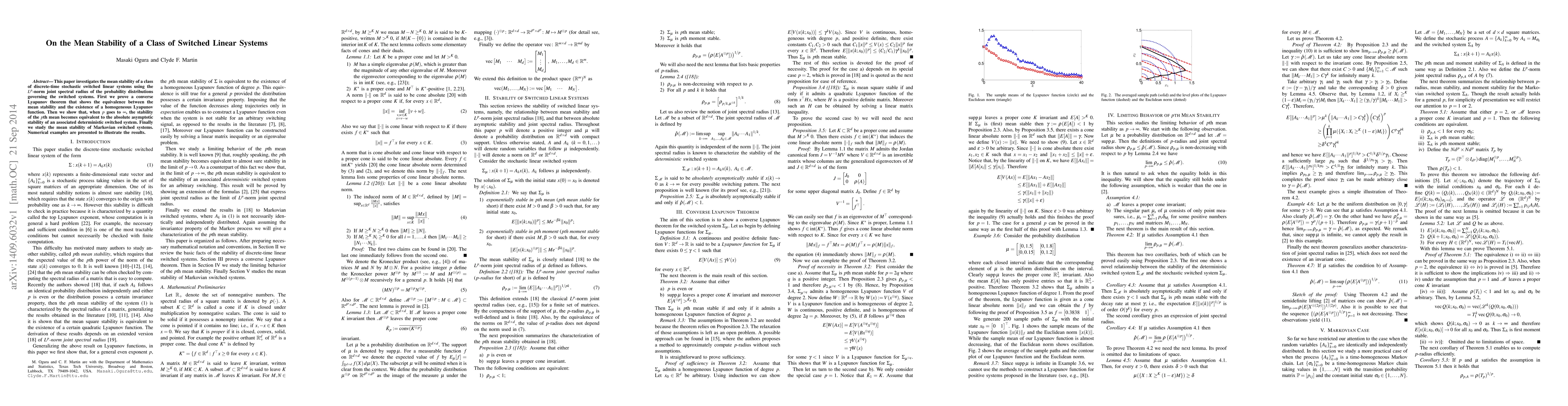 This paper investigates the mean stability of a class of discrete-time stochastic switched linear systems using the $L^p$-norm joint spectral radius of the probability distributions governing the switched systems. First we prove a converse Lyapunov theorem that shows the equivalence between the mean stability and the existence of a homogeneous Lyapunov function. Then we show that, when $p$ goes to $\infty$, the stability of the $p$th mean becomes equivalent to the absolute asymptotic stability of an associated deterministic switched system. Finally we study the mean stability of Markovian switched systems. Numerical examples are presented to illustrate the results.
