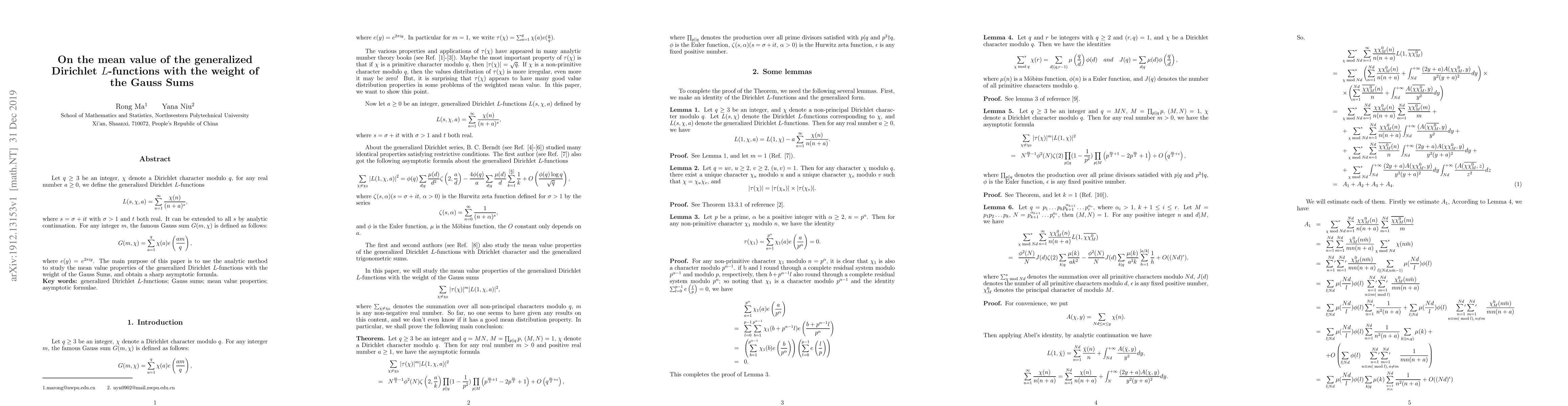 Let $q\ge3$ be an integer, $\chi$ denote a Dirichlet character modulo $q$, for any real number $a\ge 0$, we define the generalized Dirichlet $L$-functions $$ L(s,\chi,a)=\sum_{n=1}^{\infty}\frac{\chi(n)}{(n+a)^s}, $$ where $s=\sigma+it$ with $\sigma>1$ and $t$ both real. It can be extended to all $s$ by analytic continuation. For any integer $m$, the famous Gauss sum $G(m,\chi)$ is defined as follows: $$G(m,\chi)=\sum_{a=1}^{q}\chi(a)e\left(\frac{am}{q}\right), $$ where $e(y)=e^{2\pi iy}$. The main purpose of this paper is to use the analytic method to study the mean value properties of the generalized Dirichlet $L$-functions with the weight of the Gauss Sums, and obtain a sharp asymptotic formula.