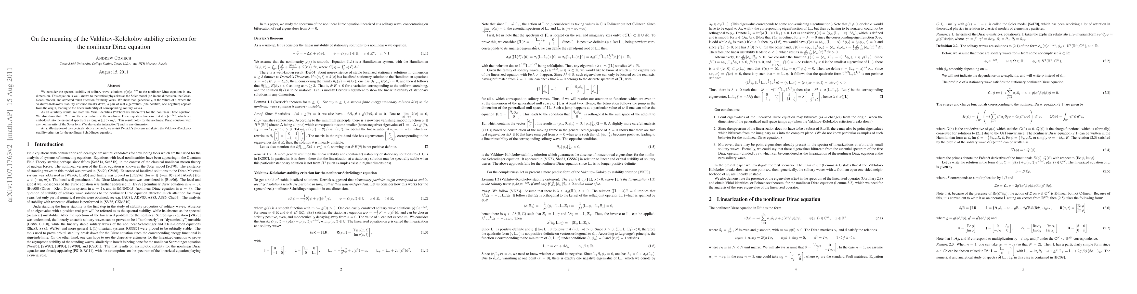 Researchers investigate the stability of solitary wave solutions to the nonlinear Dirac equation, finding that when the Vakhitov-Kolokolov criterion breaks down, these waves become linearly unstable, leading to a pair of real eigenvalues with one positive and one negative value.