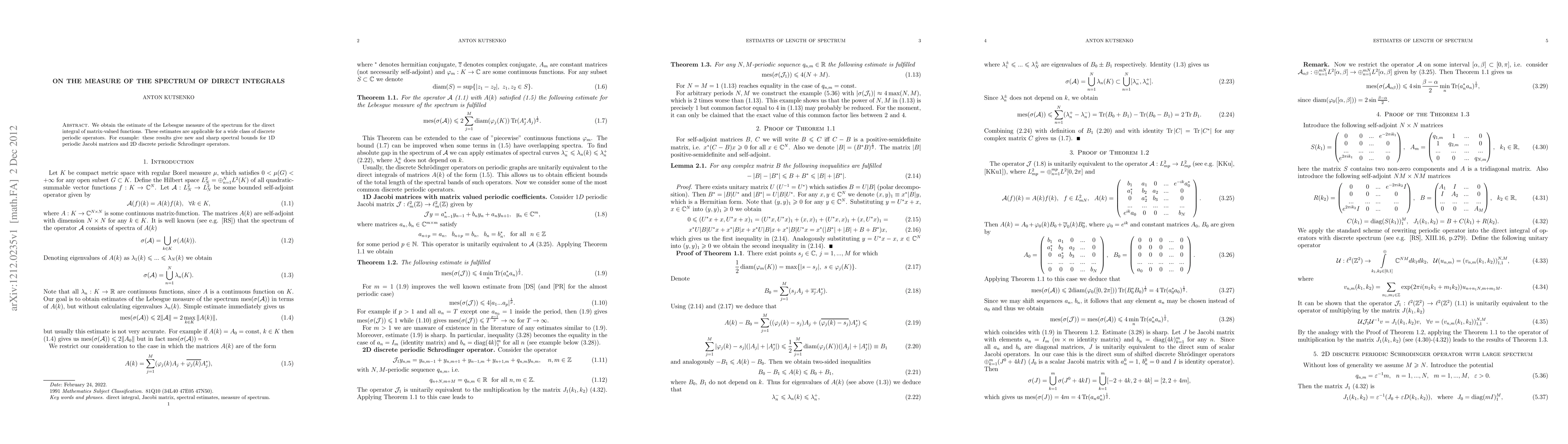 We obtain the estimate of the Lebesgue measure of the spectrum for the direct integral of matrix-valued functions. These estimates are applicable for a wide class of discrete periodic operators. For example: these results give new and sharp spectral bounds for 1D periodic Jacobi matrices and 2D discrete periodic Schrodinger operators.