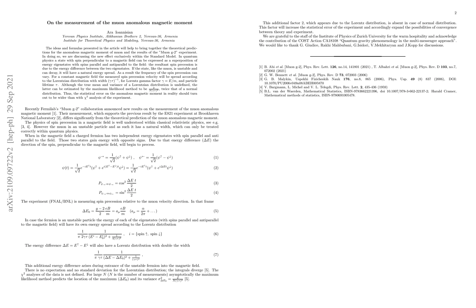 The paper presents a detailed analysis of the muon anomalous magnetic moment considering the natural energy spread of an unstable particle and its impact on the frequency of spin precession, using a Lorentzian distribution to describe the spread.